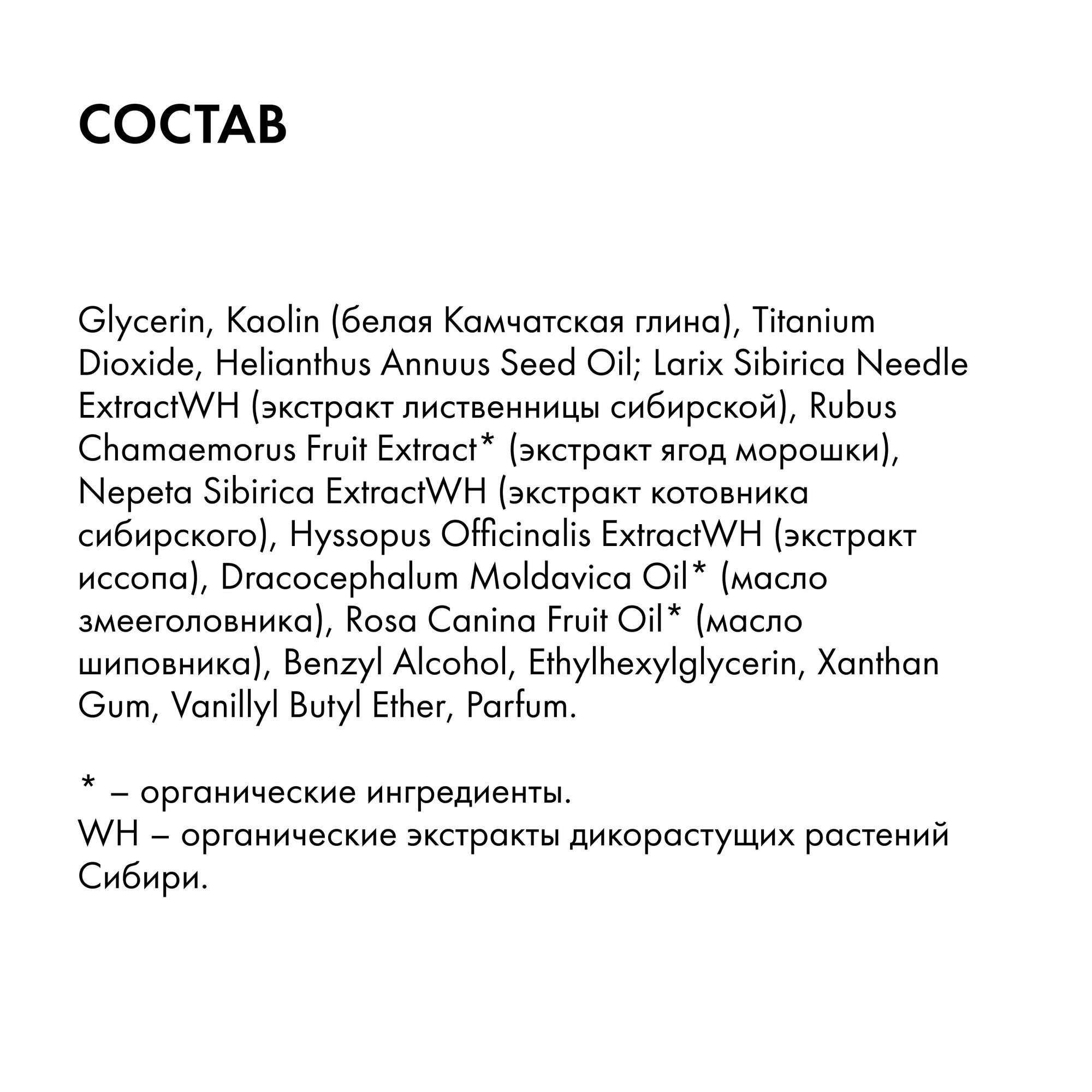 | Состав | Glycerin, Kaolin (белая Камчатская глина), Titanium Dioxide, Helianthus Annuus Seed Oil; Larix Sibirica Needle ExtractWH (экстракт лиственницы сибирской), Rubus Chamaemorus Fruit Extract* (экстракт ягод морошки), Nepeta Sibirica ExtractWH (экстракт котовника сибирского), Hyssopus Officinalis ExtractWH (экстракт иссопа), Dracocephalum Moldavica Oil* (масло змееголовника), Rosa Canina Fruit Oil* (масло шиповника), Benzyl Alcohol, Ethylhexylglycerin, Xanthan Gum, Vanillyl Butyl Ether, Parfum. |