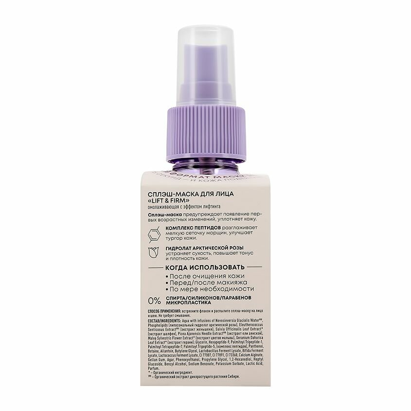 | Способ применения | Встряхните флакон и распылите сплэш-маску на лицо и шею. Не требует смывания. |