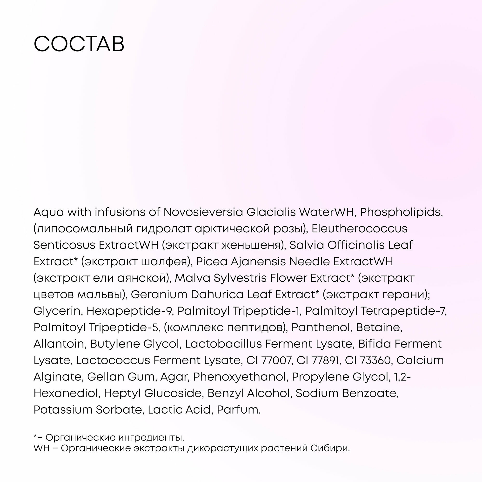 | Состав | Glycerin, Hexapeptide-9, Palmitoyl Tripeptide-1, Palmitoyl Tetrapeptide-7, Palmitoyl Tripeptide-5, (комплекс пептидов), Panthenol, Betaine, Allantoin, Butylene Glycol, Lactobacillus Ferment Lysate, Bifida Ferment Lysate, Lactococcus Ferment Lysate, CI 77007, CI 77891, CI 73360, Calcium Alginate, Gellan Gum, Agar, Phenoxyethanol, Propylene Glycol, 1,2-Hexanediol, Heptyl Glucoside, Benzyl Alcohol, Sodium Benzoate, Potassium Sorbate, Lactic Acid, Parfum. – Органический ингредиент. WH – Органический экстракт дикорастущего растения Сибири. |