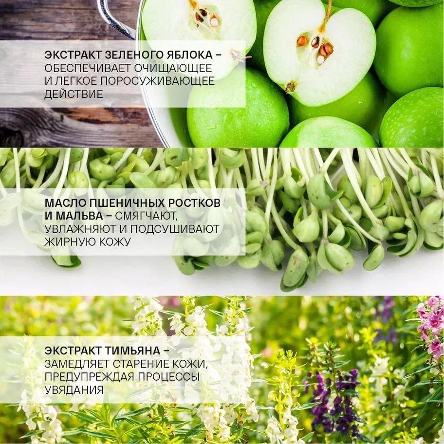 | Дополнительная информация | ОЧИЩАЮЩЕЕ И ПОРОСУЖИВАЮЩЕЕ ДЕЙСТВИЕ. Маска содержит минералы, антиоксиданты и экстракт зеленого яблока, которые обеспечивают ей очищающее и легкое поросуживающее действие. Обладает противовоспалительными и регенерирующими свойствами, борется с воспалениями, освежает и осветляет кожу. СМЯГЧЯЕТ, УВЛАЖНЯЕТ И ПОДСУШИВАЕТ. Масло пшеничных ростков и мальва смягчают, увлажняют и подсушивают жирную кожу. Содержит ретинол. КРЕМООБРАЗНАЯ КОНСИСТЕНЦИЯ. Имеет кремообразную консистенцию с легким ароматом зеленого яблока. |