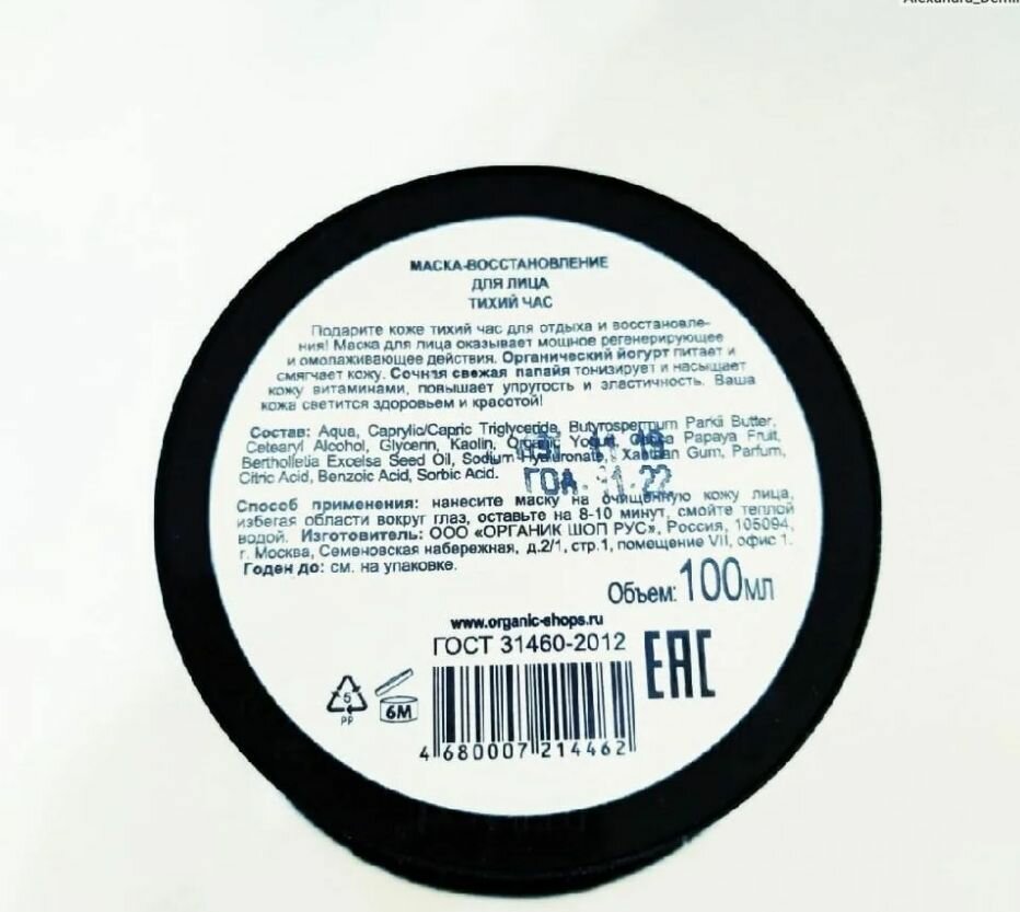 | Способ применения | нанесите маску на очищенную кожу лица, избегая области вокруг глаз, оставьте на 8-10 минут, смойте теплой водой |