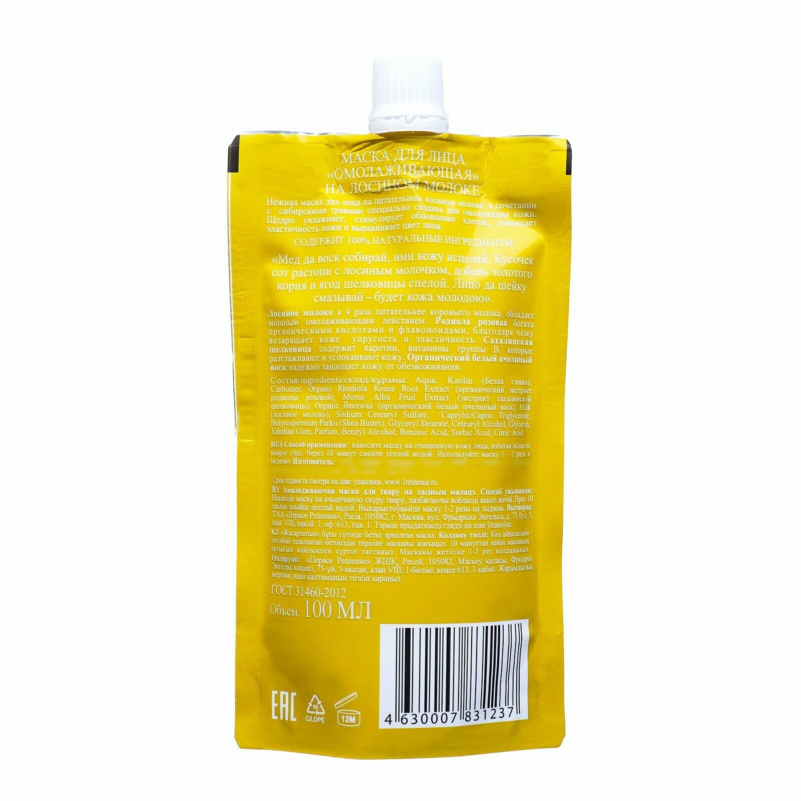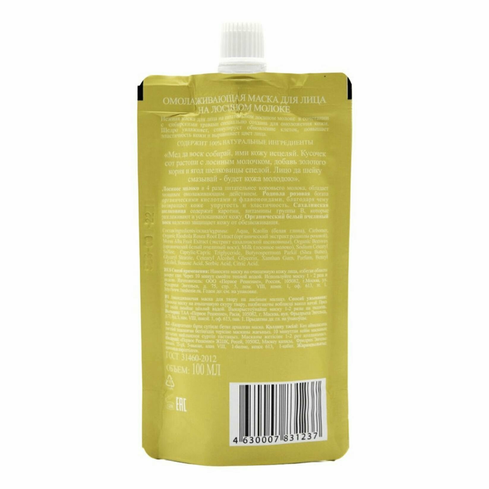 | Состав | aqua, kaolin (белая глина), carbomer, organic rhodiola rosea root extract (органический экстракт родиолы розовой), morus alba fruit extract (экстракт сахалинской шелковицы), organic beeswax (органический белый пчелиный воск), milk (лосиное молоко), sodium cetearyl sulfate, caprylic/capric triglyceride, butyrospermum parkii (shea butter), glyceryl stearate, cetearyl alcohol, glycerin, xanthan gum, parfum, benzyl alcohol, benzoic acid, sorbic acid, citric acid |
