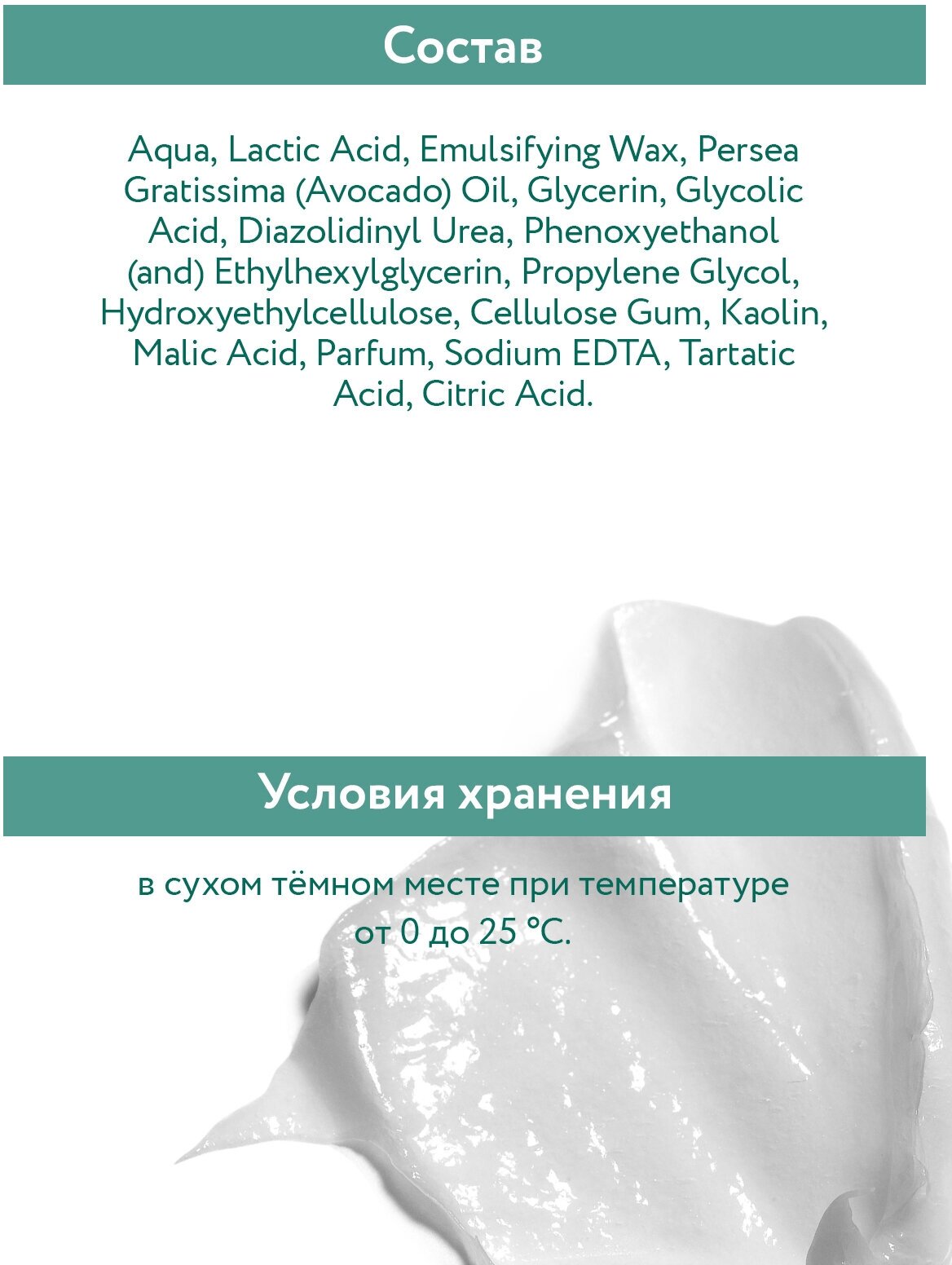 | Состав | aqua, lactic acid, emulsifying wax, persea gratissima (avocado) oil, glycerin, glycolic acid, diazolidinyl urea, phenoxyethanol (and) ethylhexylglycerin, propylene glycol, hydroxyethylcellulose, cellulose gum, kaolin, malic acid, parfum, sodium edta, tartatic acid, citric acid |