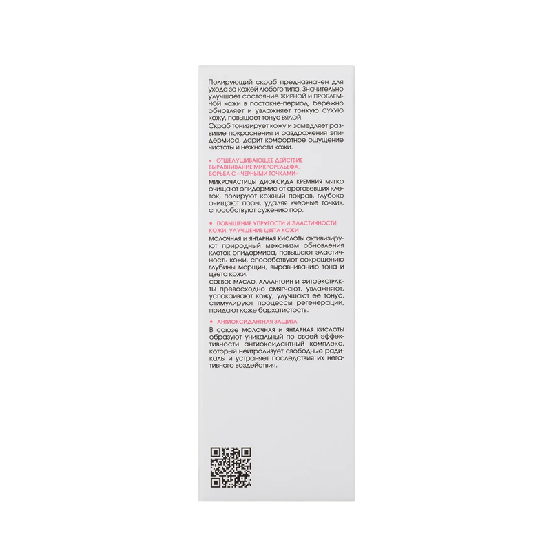 | Дополнительная информация | После применения скраба рекомендуется избегать интенсивного воздействия солнечных лучей и перед выходом из помещения обязательно наносить на кожу солнцезащитный крем с SPF не менее 15. Противопоказания: Травмированный кожный покров, проблемная кожа в период обострения, индивидуальная непереносимость компонентов |