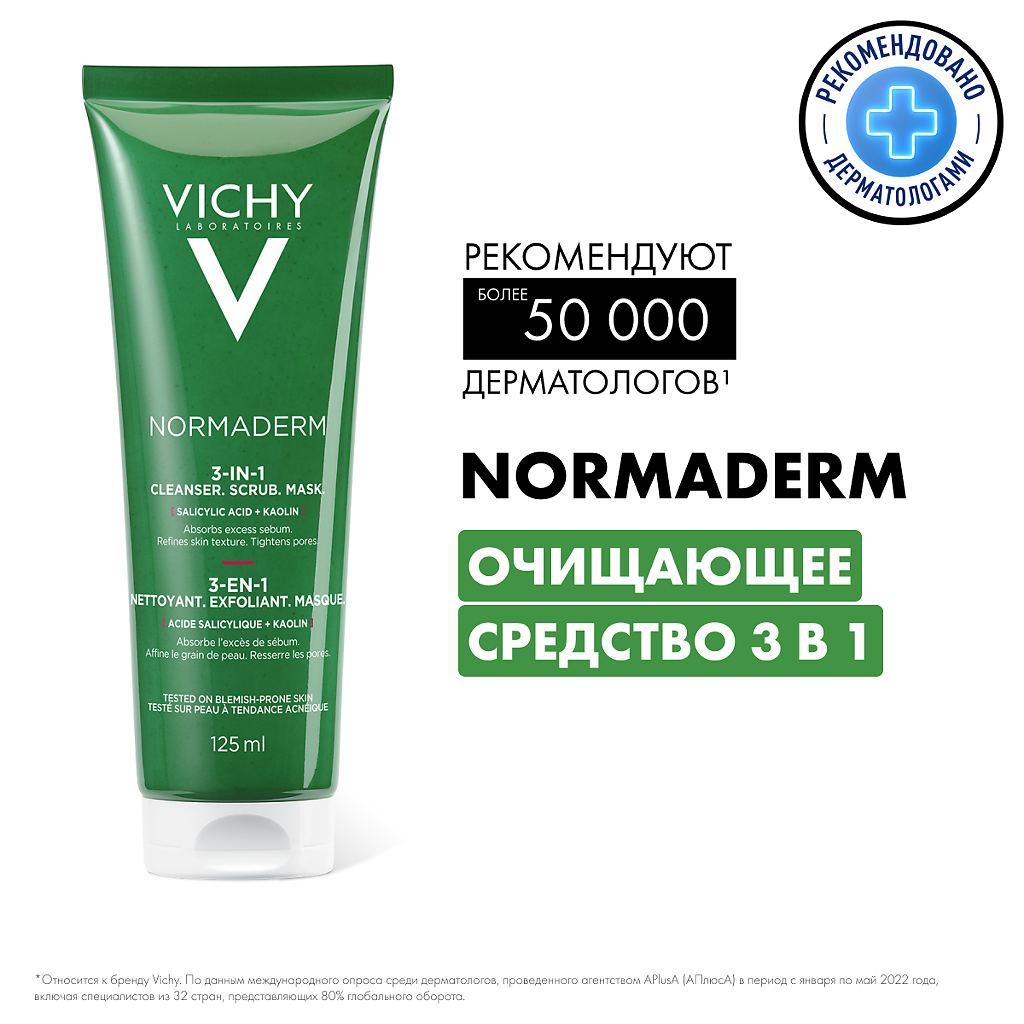 Normaderm Средство 3в1 Гель-Скраб-Маска для интенсивного очищения жирной проблемной кожи, 125 мл, VICHY