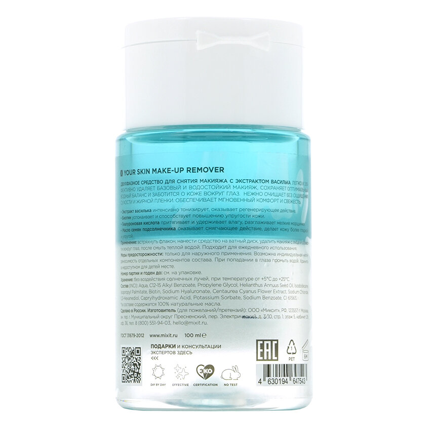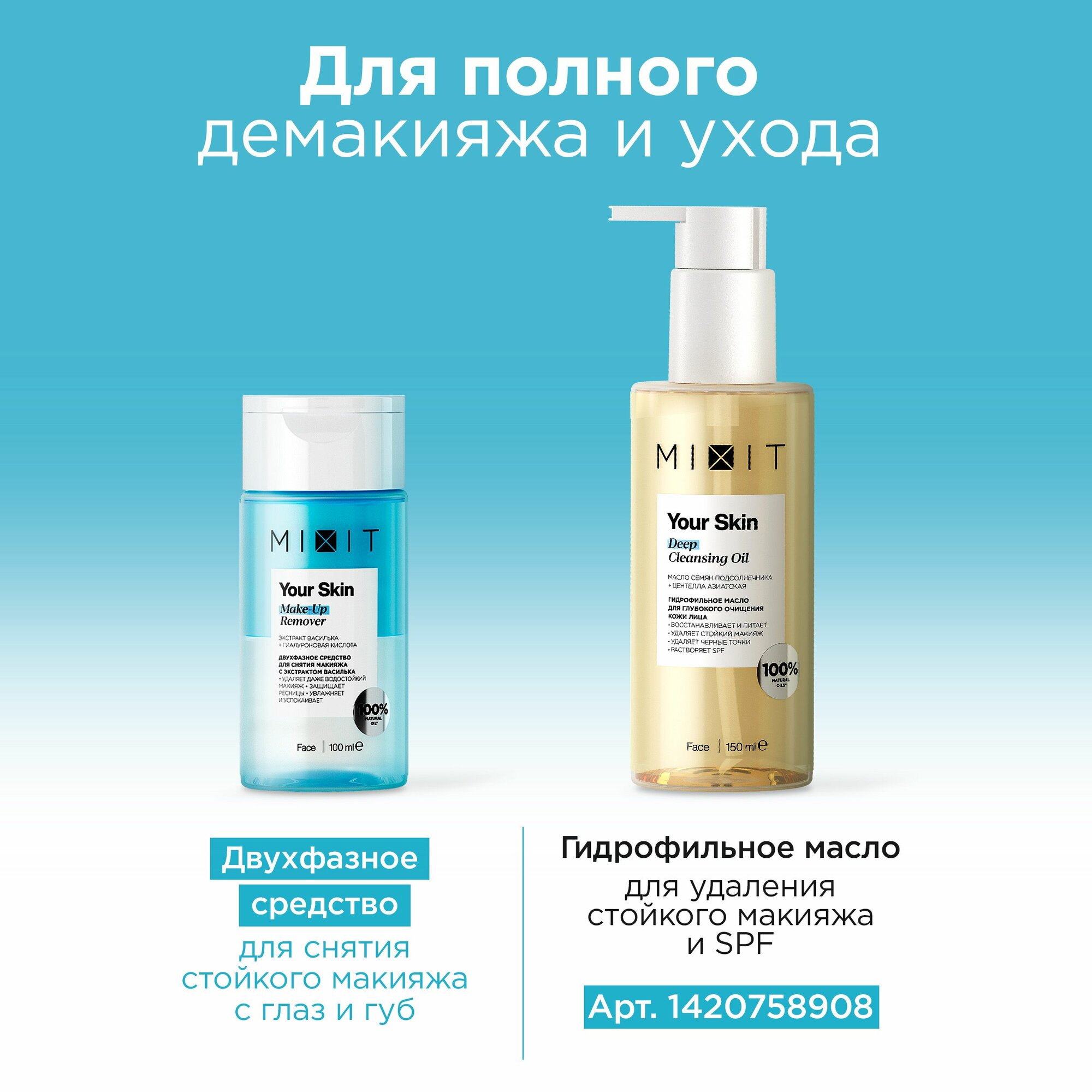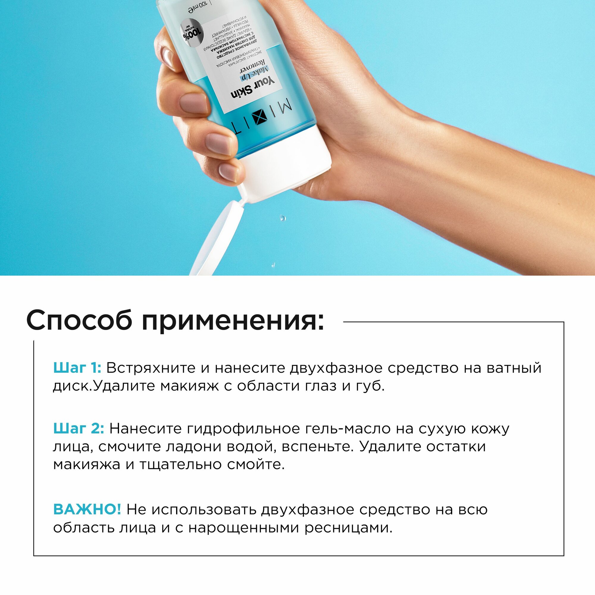 Средство для снятия водостойкого макияжа MIXIT Your Skin Make-Up Remover, двухфазное, профессиональное, с экстрактом василька, 100 мл интересное: