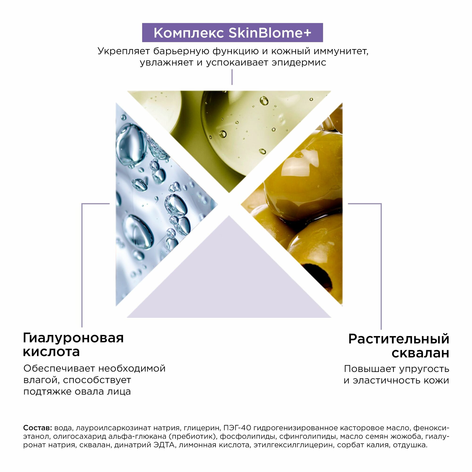 | Состав | Водный комплекс экстрактов геля алоэ вера, зеленого чая, ромашки, коко-сульфат натрия, кокамидопропилбетаин, глицерин, гликолевая кислота, кокоамфоацетат натрия, гидроксид натрия, гликольдистеарат, увлажняющий комплекс ELFAMOIST, растительные экстракты готу колы, лакричника, розмарина, дегидроацетовая кислота, бензиловый спирт, ПЭГ-7 глицерил кокоат, аллантоин, парфюмерная композиция. |
