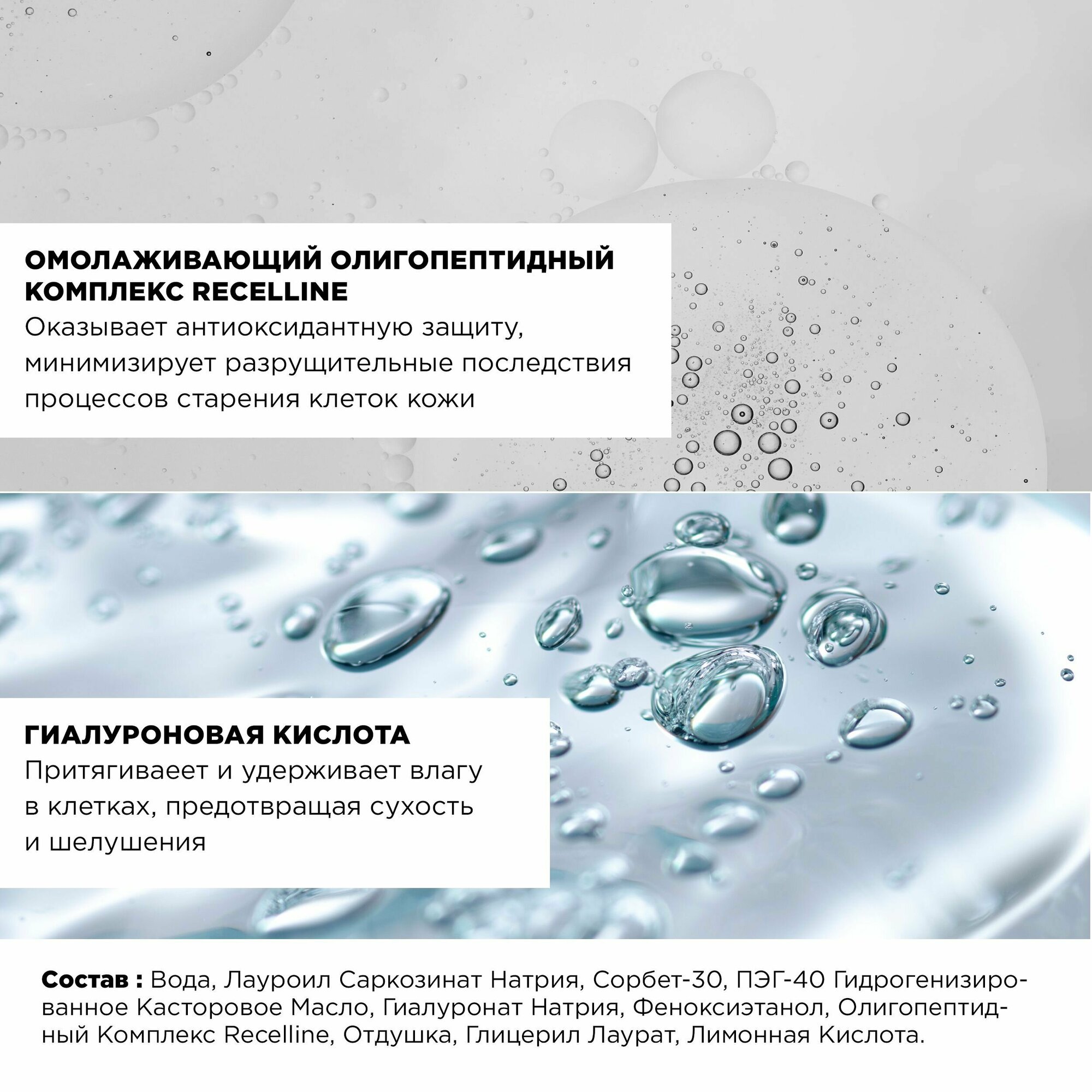 | Состав | Водный комплекс экстрактов геля алоэ вера, зеленого чая, ромашки, коко-сульфат натрия, кокамидопропилбетаин, глицерин, гликолевая кислота, кокоамфоацетат натрия, гидроксид натрия, гликольдистеарат, увлажняющий комплекс ELFAMOIST, растительные экстракты готу колы, лакричника, розмарина, дегидроацетовая кислота, бензиловый спирт, ПЭГ-7 глицерил кокоат, аллантоин, парфюмерная композиция. |