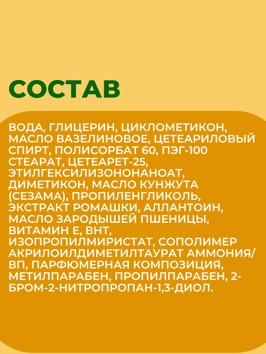 | Состав | вода, глицерин, циклометикон, масло вазелиновое, цетеариловый спирт, полисорбат 60, ПЭГ-100 стеарат, цетеарет-25, этилгексилизононаноат, диметикон, масло кунжута (сезама), пропиленгликоль, экстракт ромашки, аллантоин, масло зародышей пшеницы, витамин Е, ВНТ, изопропилмиристат, сополимер акрилоилдиметилтаурат аммония/ВП, парфюмерная композиция, метилпарабен, пропилпарабен, 2-бром-2-нитропропан-1,3-диол |