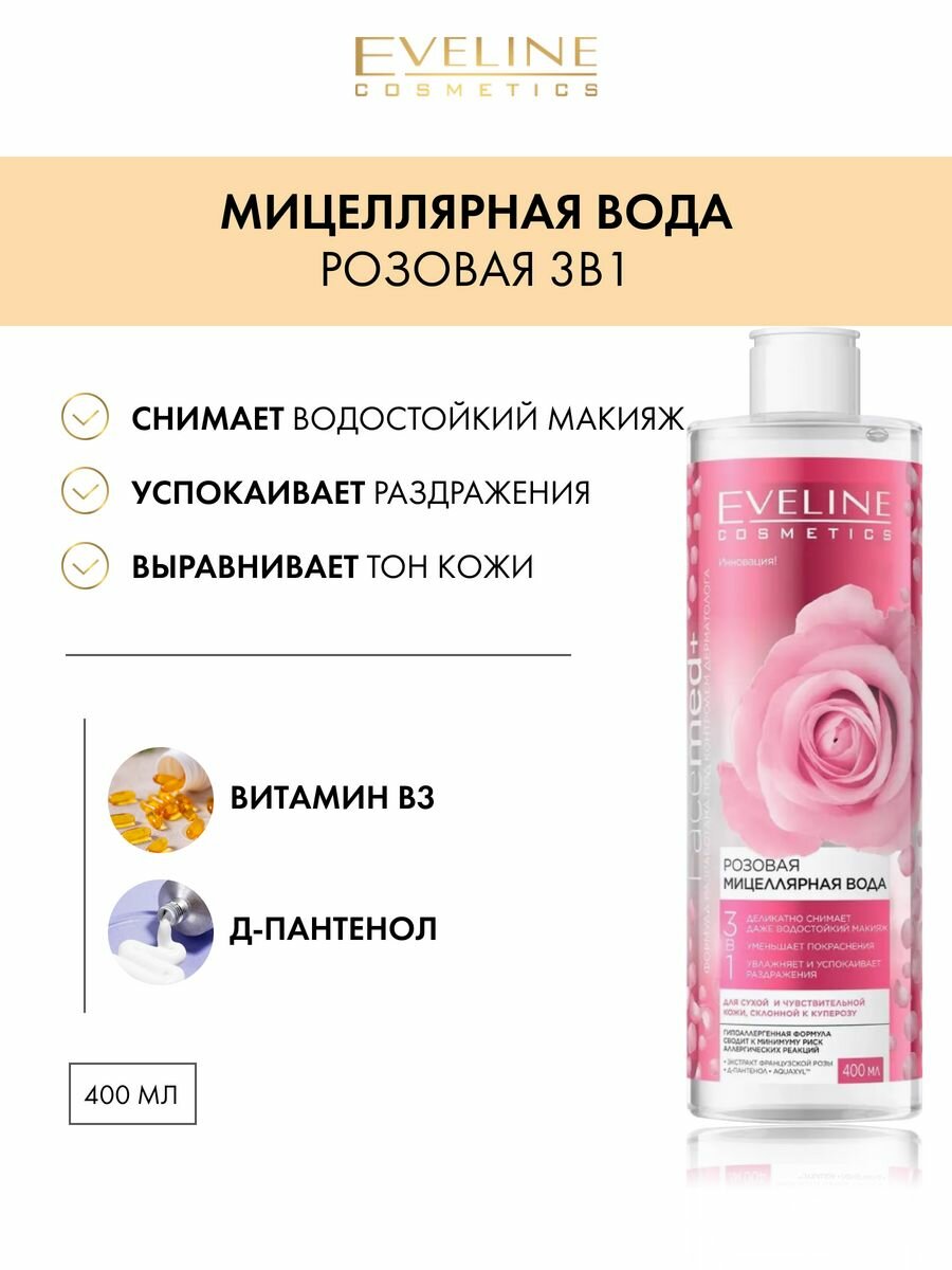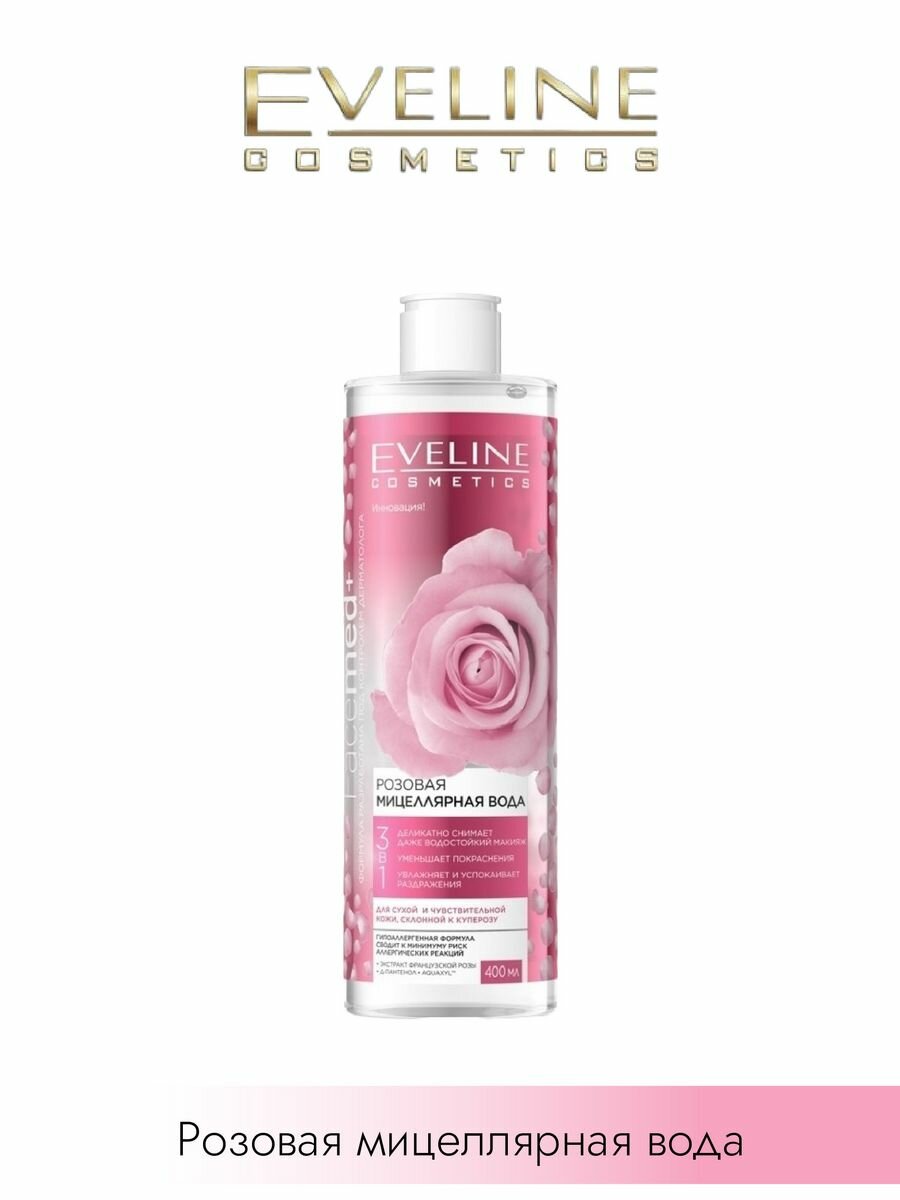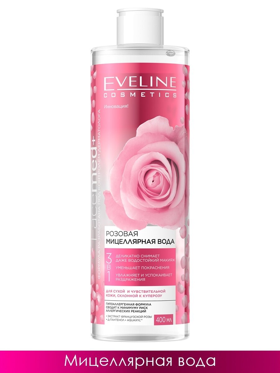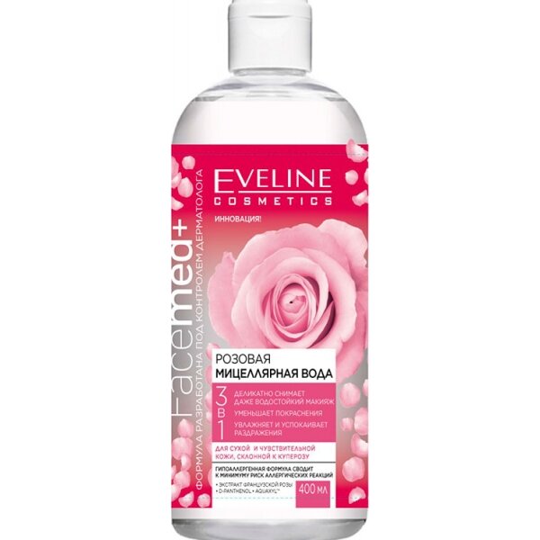 Мицеллярная вода 3в1 EVELINE FACEMED+ розовая для снятия макияжа, 400 мл
