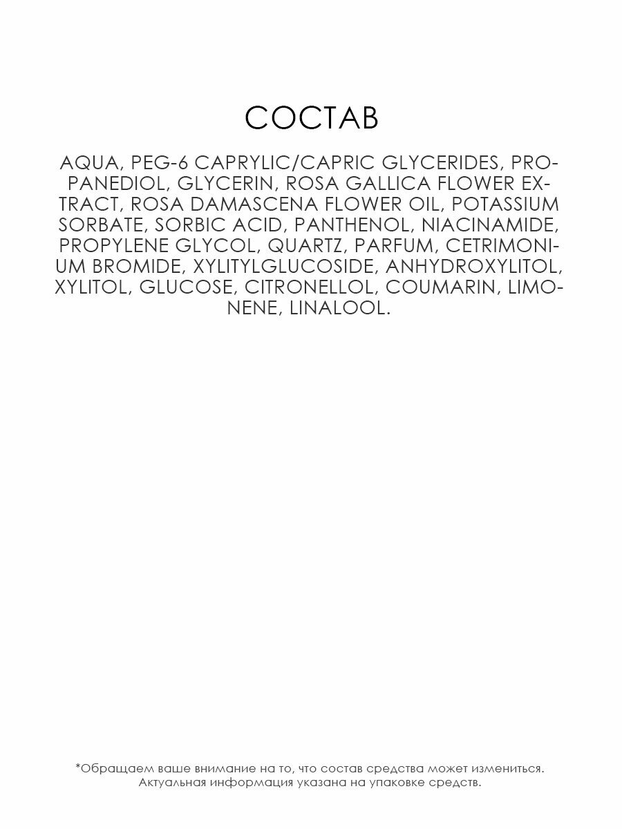 | Состав | aqua, peg-6 caprylic/capric glycerides, propanediol, glycerin, rosa gallica flower extract, rosa damascena flower oil, potassium sorbate, sorbic acid, panthenol, niacinamide, propylene glycol, quartz, parfum, cetrimonium bromide, xylitylglucoside, anhydroxylitol, xylitol, glucose, citronellol, coumarin, limonene, linalool |