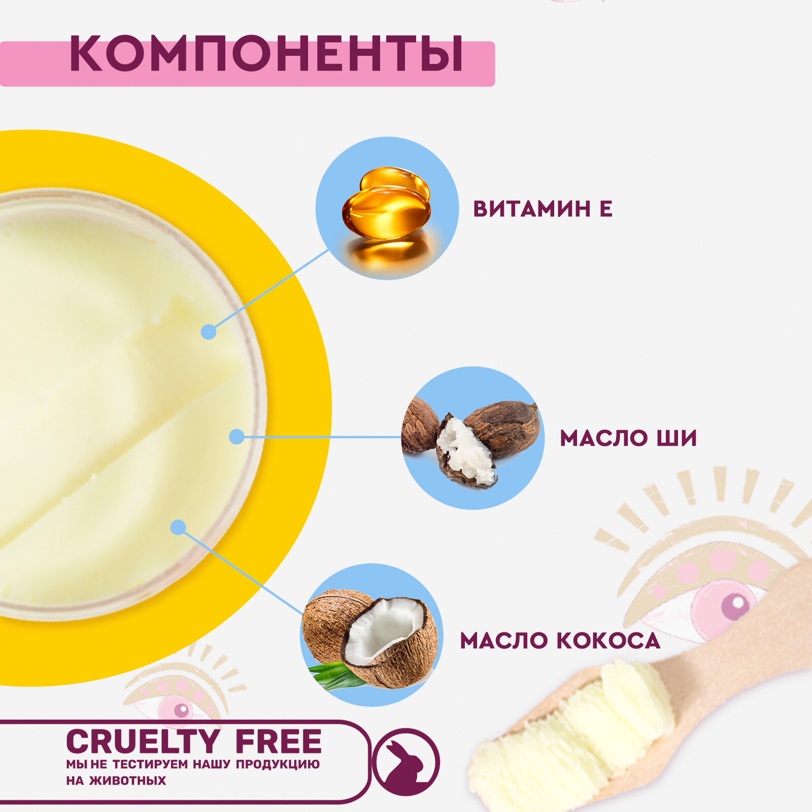 | Состав | Butyrospermum Parkii (Shea) Butter, Myristyl Myristate, Cocos Nucifera (Coconut) Oil, Cetearyl Alcohol, Polysorbate 60, Isopropyl Palmitate, Stearic Acid, PEG-20 Glyceryl Triisostearate, Tocopheryl Acetate, Parfum, Hexyl Cinnamal, Limonene, Linalool, CI 47005 |