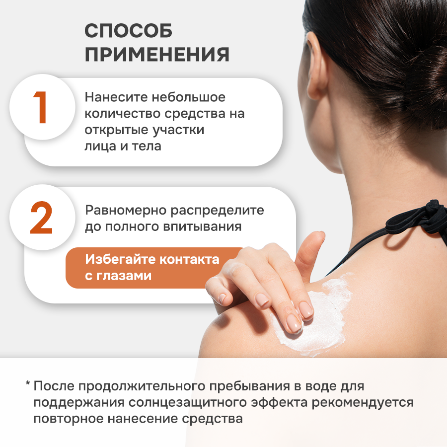 | Способ применения | Нанесите небольшое количество средства на открытые участки лица и тела и равномерно распределите до полного впитывания. После продолжительного пребывания в воде для поддержания солнцезащитного эффекта рекомендуется повторное нанесение средства. Избегайте контакта с глазами. |