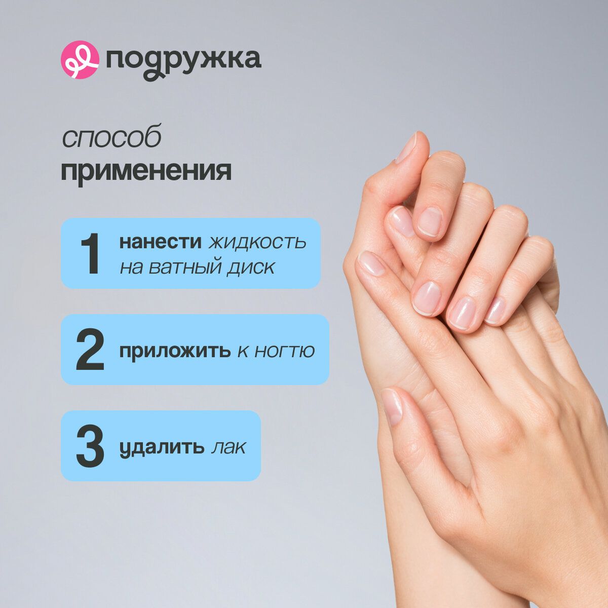 | Способ применения | Нанесите жидкость на ватный диск. Приложите к ногтю. Удалите лак. |
