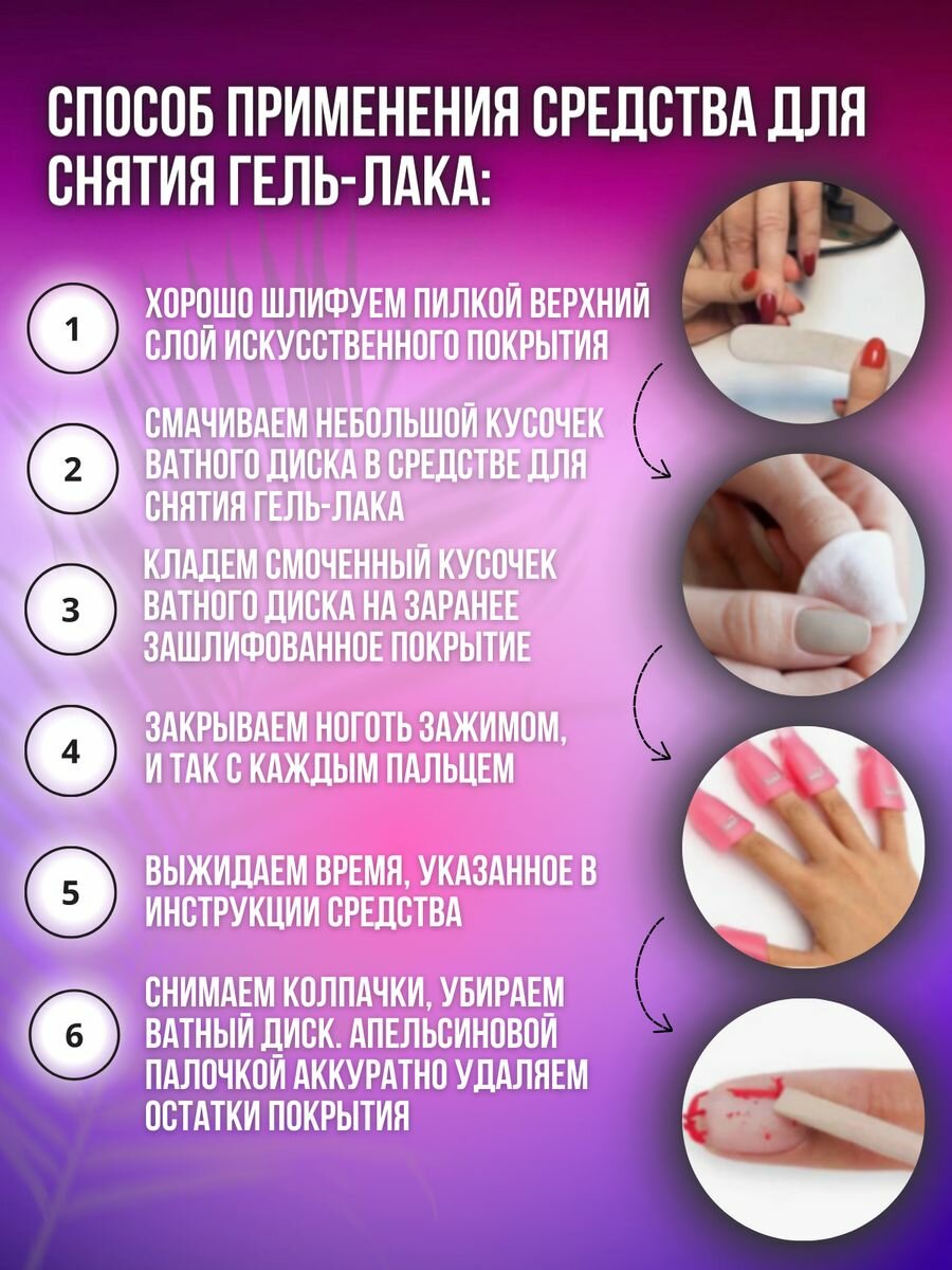 | Подробная комплектация | Средство для снятия гель-лака, апельсиновые палочки 5 шт., зажимы для ногтей, пилочка для ногтей, Бафик 1шт. |