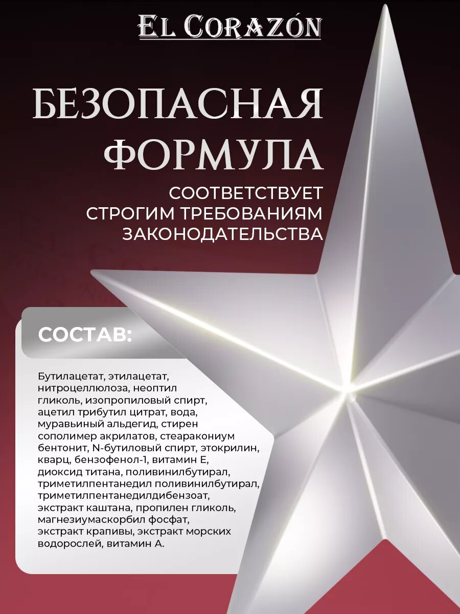 | Состав | бутилацетат, этилацетат, нитроцеллюлоза, неотил гликоль, изопропиловый спирт, ацетил трибутил цитрат, вода, муравьиный альдегит, стирен сополимер акрилатов, стеаракониум бентонит, N-бутиловый спирт, этокрилин, кварц, бензофенол-1, витамин E, диоксид титана, поливинил бутирал, триметилпентанедил поливинил бутирал, триметилпентанедил дибензоат, экстракт каштана, пропилен гликоль, магнезиум аскорбил фосфат, экстракт крапивы, экстракт морских водорослей, витамин A, красители |