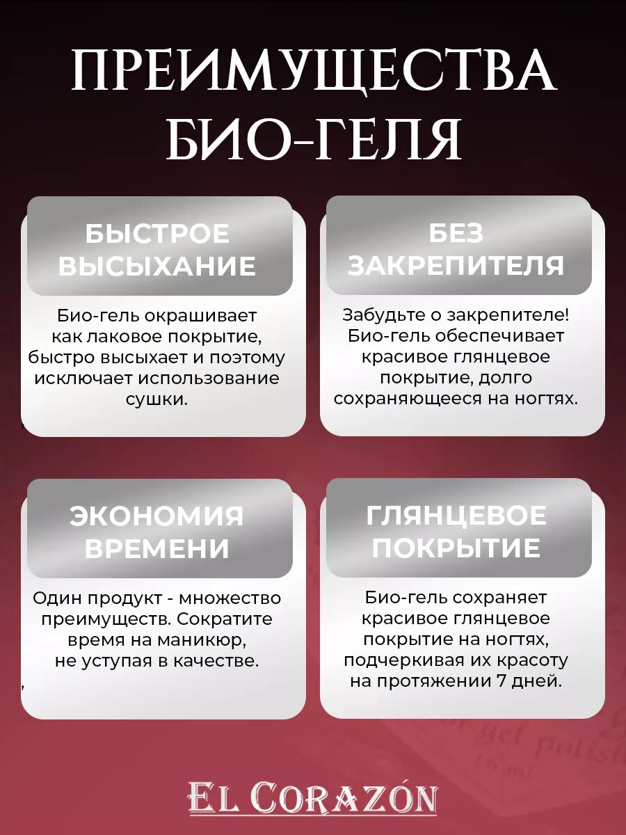 | Способ применения | покрыть ногти 1-2 слоями активного биогеля, дать высохнуть на воздухе |