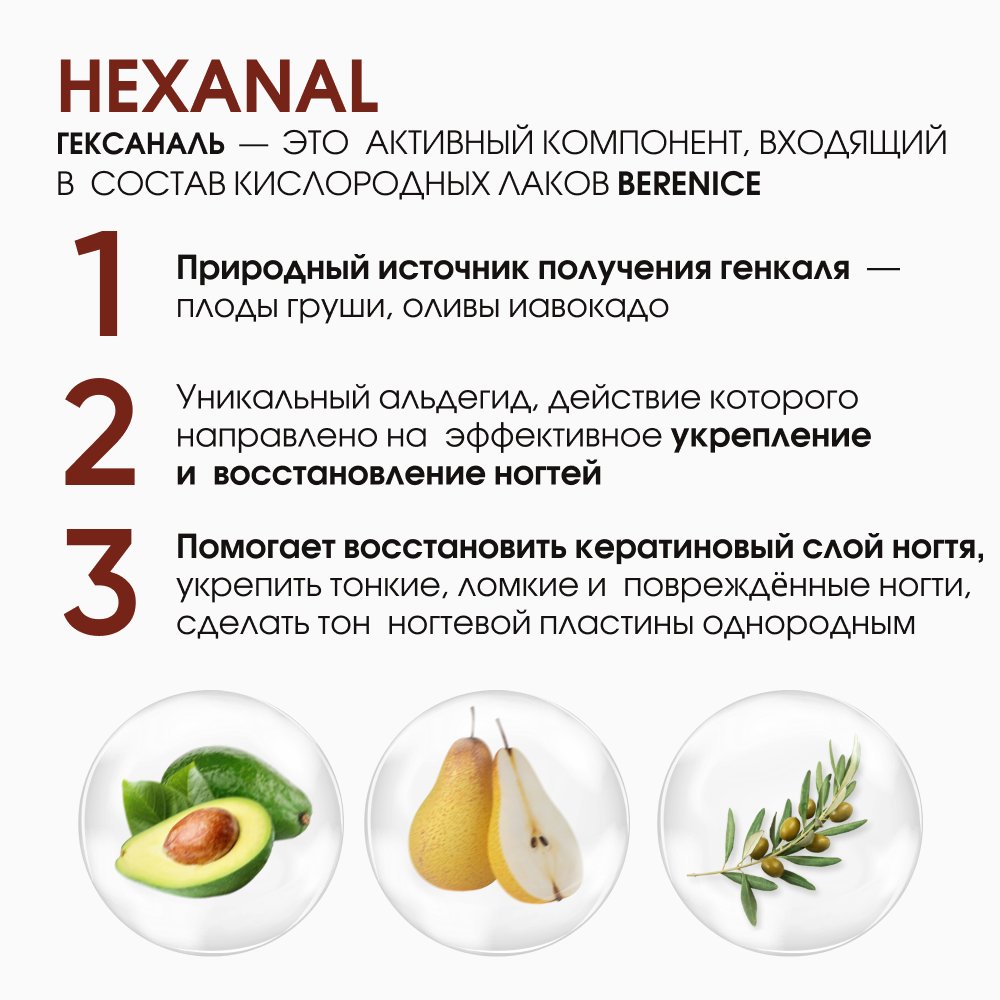 | Способ применения | Нанесите лак в один или два тонких слоя, дав каждому просохнуть. Кислородные лаки BERENICE рекомендуется использовать с кислородной базой OXYGEN BASE и кислородным топом OXYGEN TOP COAT от BERENICE. |
