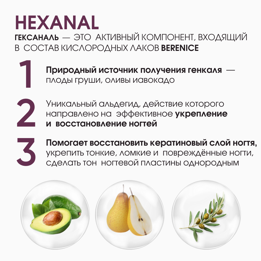 | Способ применения | Нанесите лак в один или два тонких слоя, дав каждому просохнуть. Кислородные лаки BERENICE рекомендуется использовать с кислородной базой OXYGEN BASE и кислородным топом OXYGEN TOP COAT от BERENICE. |