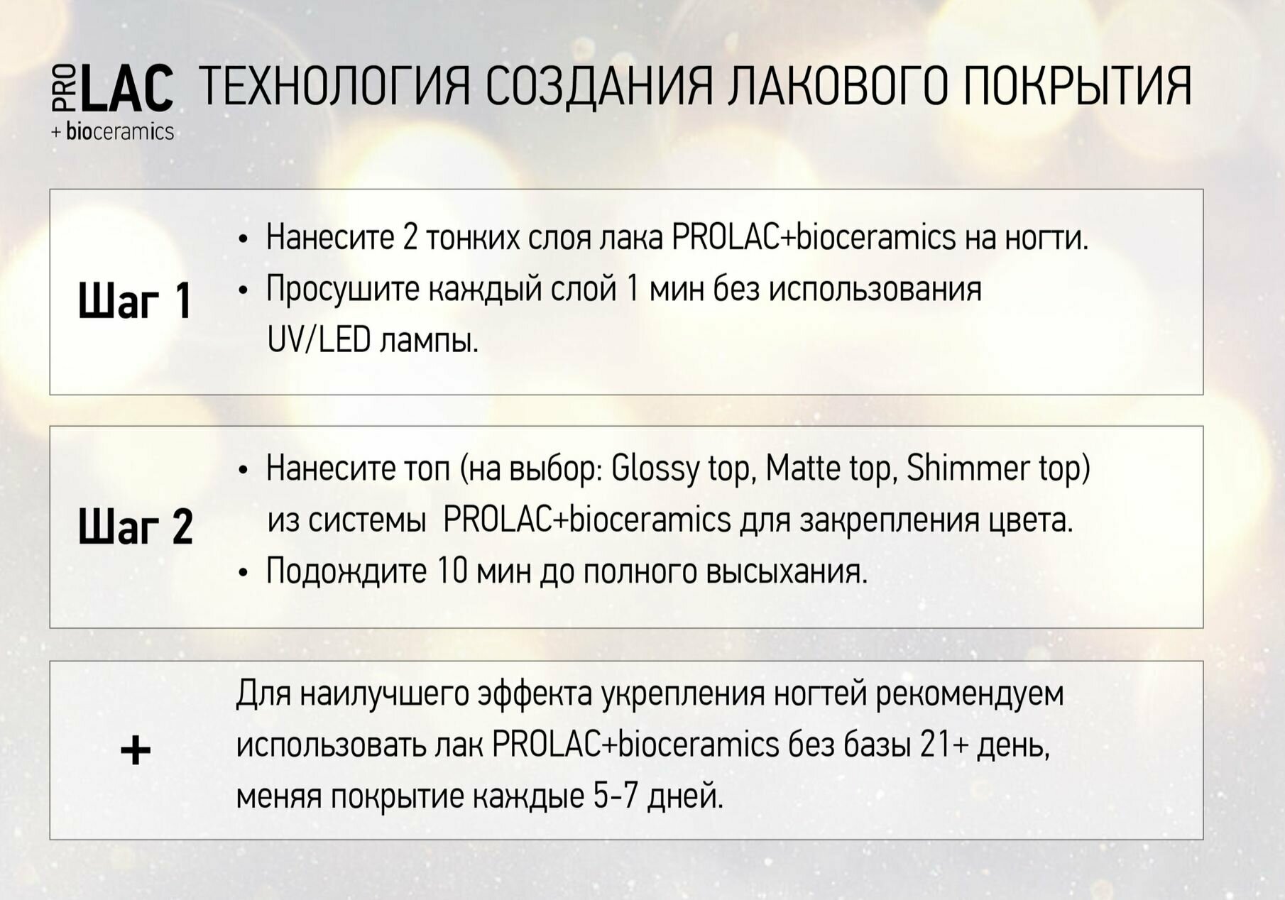 | Способ применения | нанесите 2 тонких слоя цветного лака для ногтей Color ProLac+bioceramics на ногтевую пластину. Просушите каждый слой в течение 1 минуты без использования UV/LED лампы. Завершите процедуру с топом на выбор (Glossy top/ Matte top/ Shimmer top) ProLac+bioceramics для устойчивого маникюра. Не требуется использование базового покрытия |