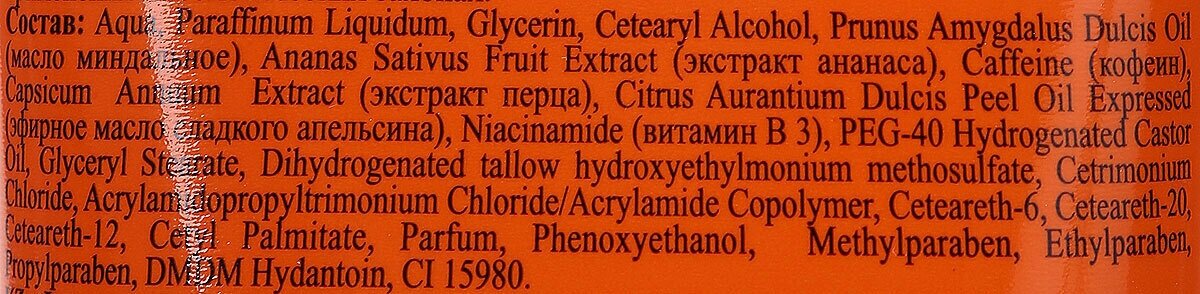 | Состав | Aqua, Paraffinum Liquidum, Glycerin, Cetearyl Alcohol, Prunus Amygdalus Dulcis Oil (масло миндальное), Ananas Sativus Fruit Extract (экстракт ананаса), Caffeine (кофеин), Capsicum Annuum Extract (экстракт перца), Citrus Aurantium Dulcis Peel Oil Expressed (эфирное масло сладкого апельсина), Niacinamide (витамин В 3), PEG-40 Hydrogenated Castor Oil, Glyceryl Stearate, Dihydrogenated tallow hydroxyethylmonium methosulfate, Cetrimonium Chloride, Acrylamidopropyltrimonium Chloride/Acrylamide Copolymer, Ceteareth-6, Ceteareth-20, Ceteareth-12, Cetyl Palmitate, Parfum, Phenoxyethanol, Methylparaben, Ethylparaben, Propylparaben, DMDM Hydantoin, CI 15980 |