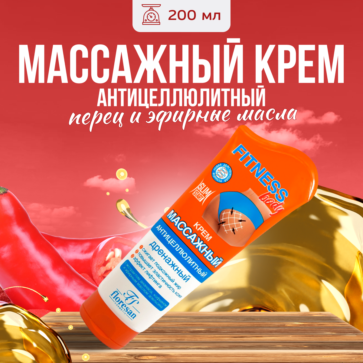 Floresan Крем массажный антицеллюлитный дренажный Fitness Body с эфирным маслом апельсина и красным перцем 500 мл