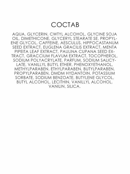 | Состав | Aqua, Glycerin, Cwtyl Alcohol, Glycine Soja Oil, Dimethicone, Glyceryl Stearate Se, Propylene Glycol, Caffeine, Aesculus, Hippocastanum Seed Extract, Euglena Gracilis Extract, Menta Pipeita Leaf Extract, Paulina Cupana Seed Extract, Graccium Flavum Extract, Tocopherol, Sodium Polyacrylate, Parfum, Sodium Salicylate, Vanillyl Butyl Ether, Phenoxyethanol, Methylparaben, Ethylparaben, Butylparaben, Propylparaben, Dmdm Hydantoin, Potassium Sorbate, Sodium Benzoate, Butylene Glycol, Butyl Alcohol, Lecithin, Vanillyl Alcohol, Vanilin, Silica |