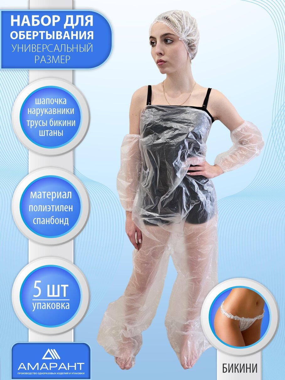 Купить Штаны для обертывания Амарант полиэтиленовые Набор 5 шт + нарукавники +трусы женские одноразовые+шапочка полиэтиленовая