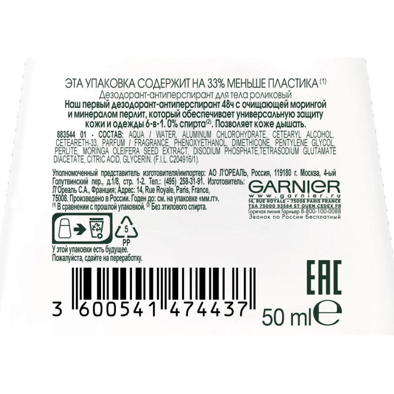 Garnier Mineral Дезодорант-антиперспирант роликовый 6-в-1 Защита 48 часов, 50 мл