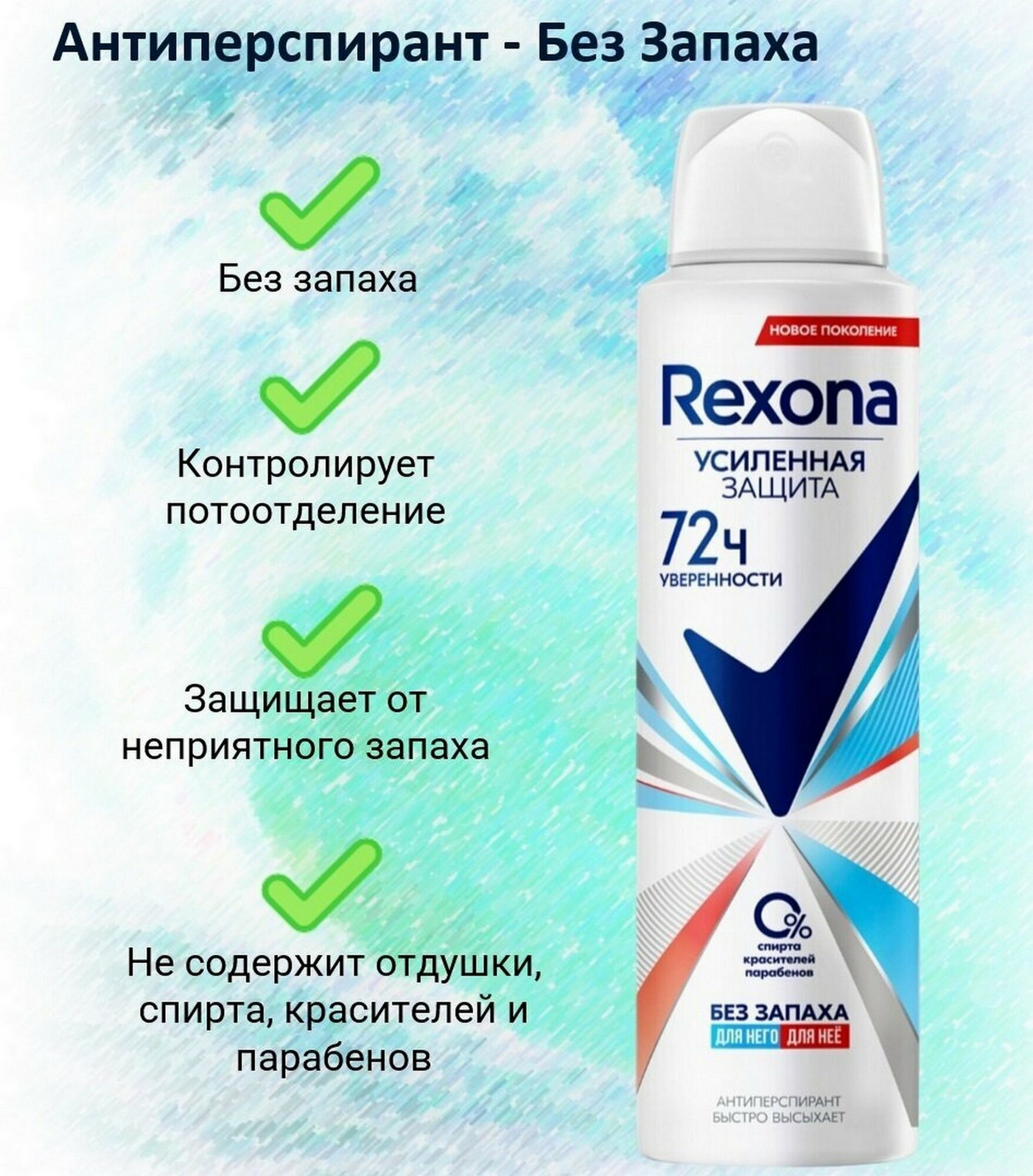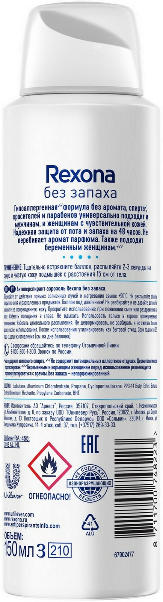 Антиперспирант аэрозольный 150 мл, REXONA "Без запаха", усиленная защита, унисекс