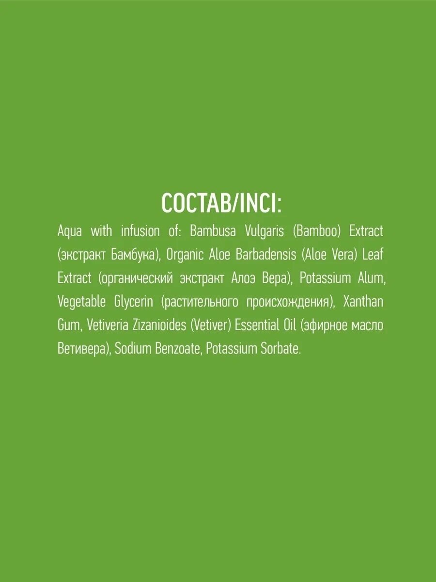 | Полный состав | INCI: Aqua, Potassium Alum, Glycerin, Xanthan Gum |