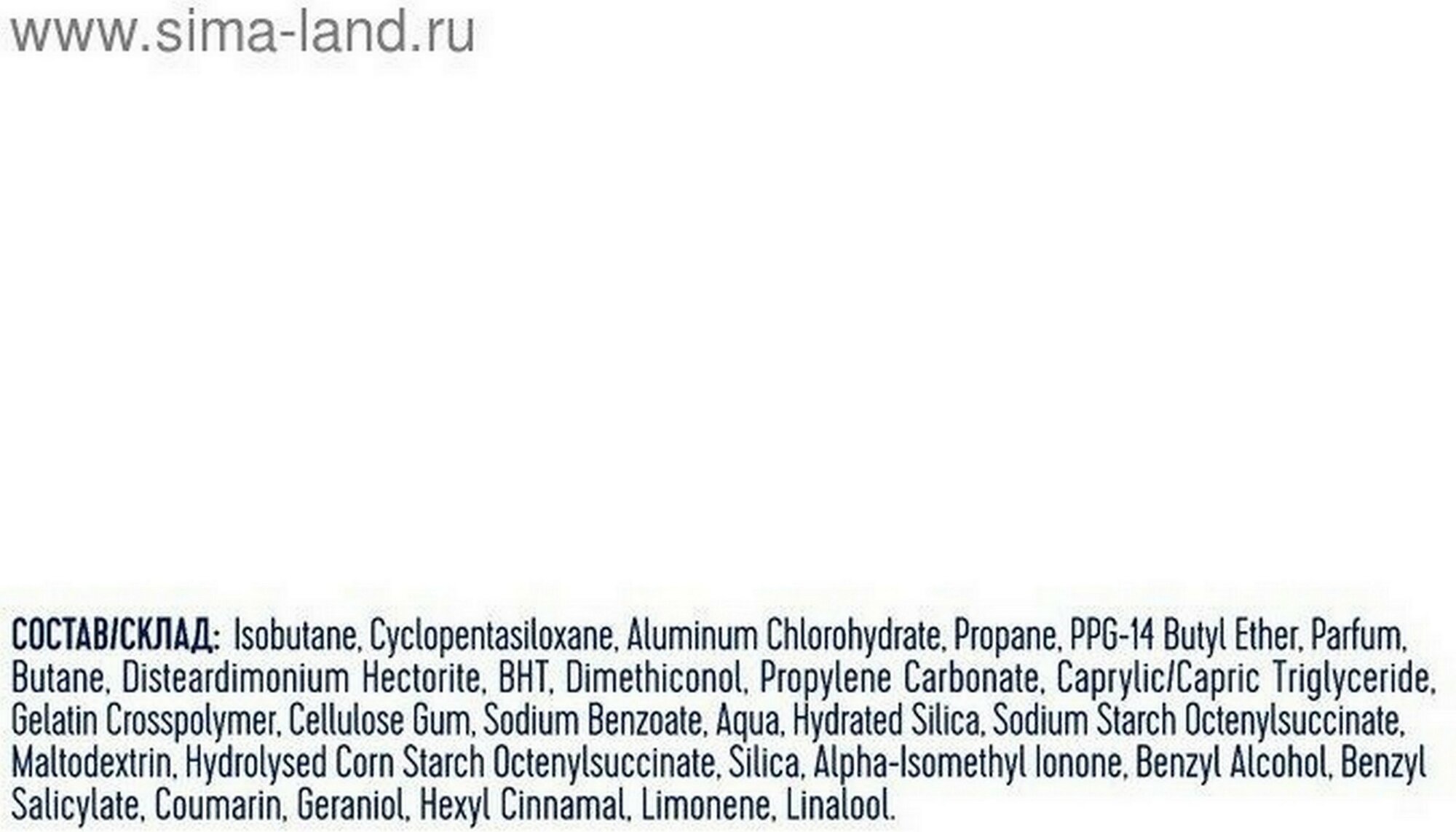 | Полный состав | Изобутан, Хлоргидрат Алюминия, Пропан, Циклопентасилоксан, Бутиловый эфир PPG-14, Бутан, Парфюмерная |