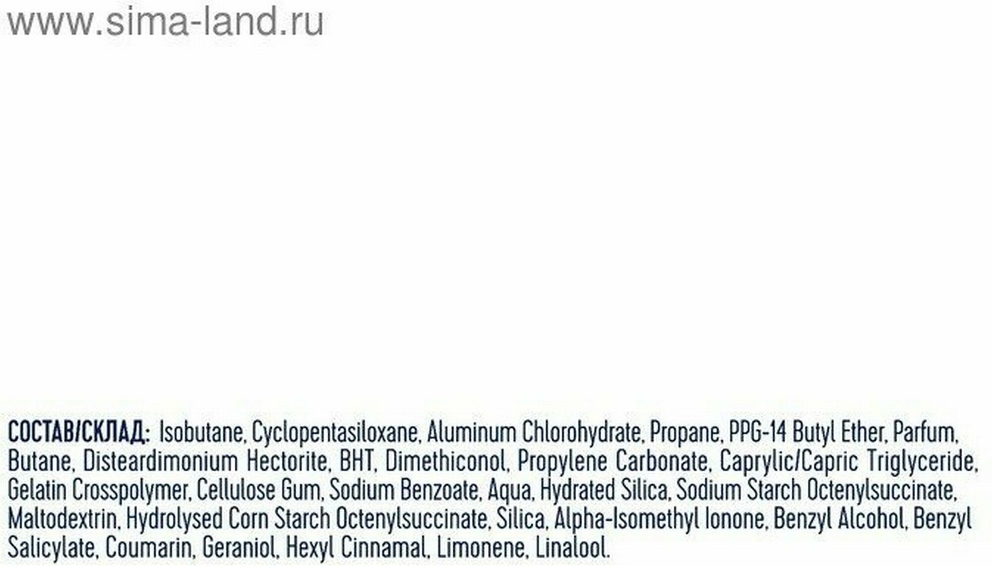 | Полный состав | Изобутан, Хлоргидрат Алюминия, Пропан, Циклопентасилоксан, Бутиловый эфир PPG-14, Бутан, Парфюмерная |