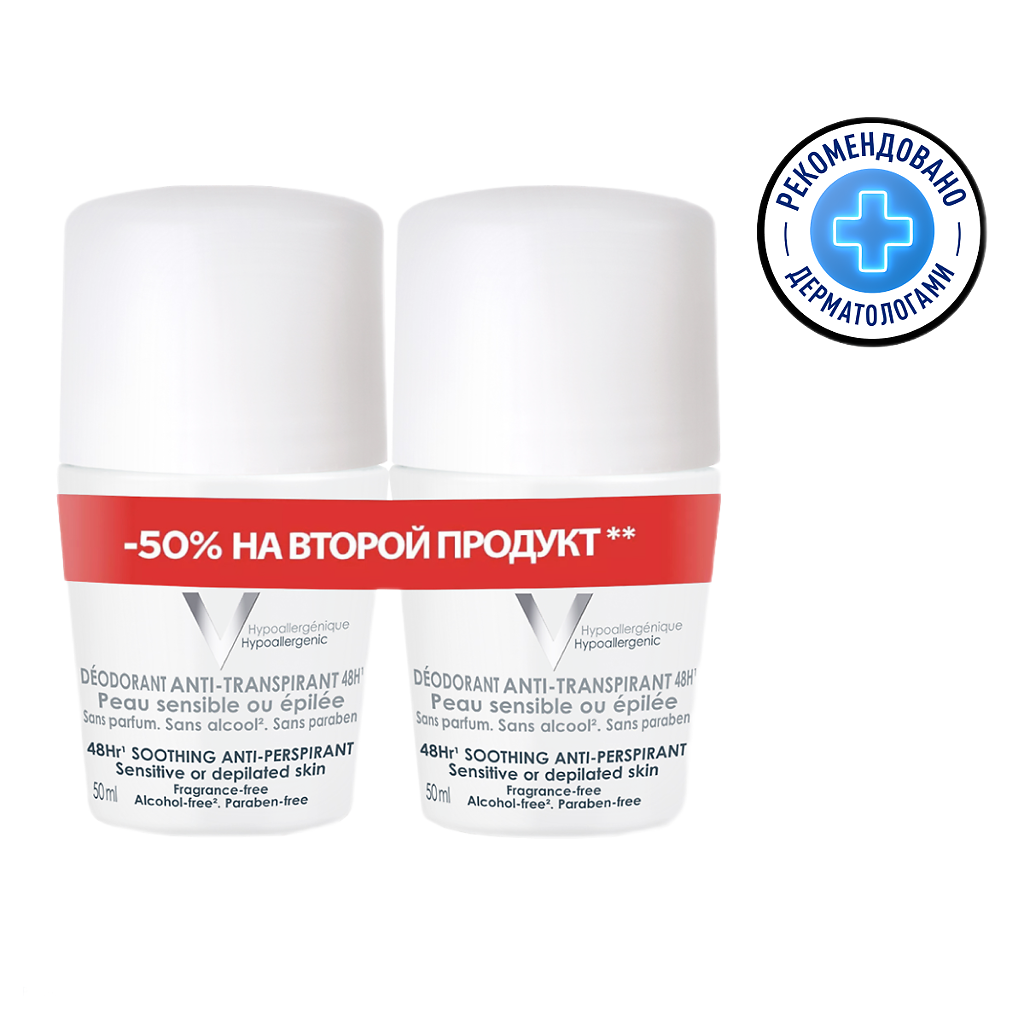 Дезодорант шариковый Vichy для чувствительной кожи, 48ч, 50 мл х2 шт (промо)