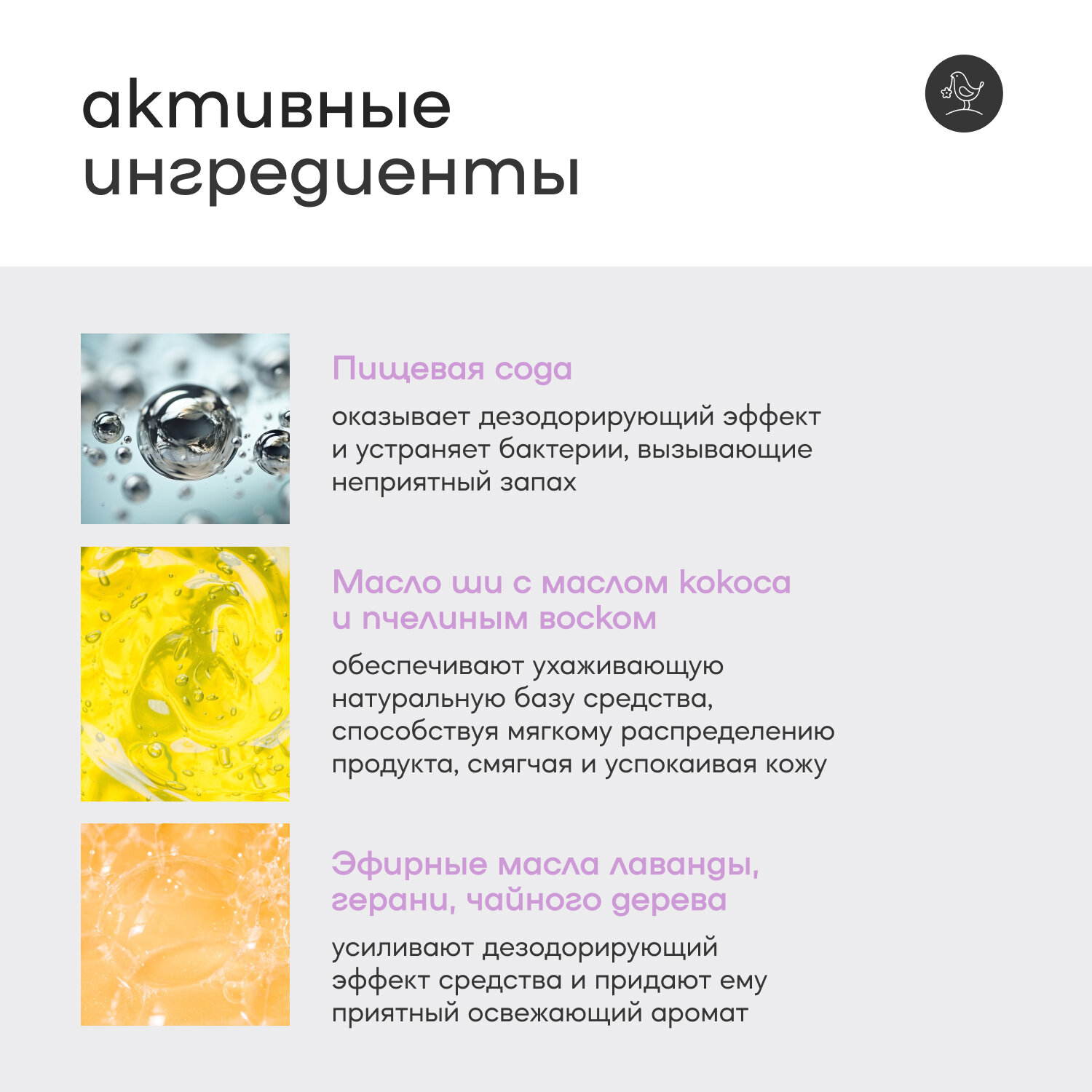 | Полный состав | Sodium Bicarbonate (Сода пищевая), Corn Starch (Кукурузный крахмал), Cocos Nucifera Oil (Масло кокоса), Butyrospermum Parkii Butter (Масло ши), Cera Alba (Воск пчелиный), Allantoin (Аллантоин), Lavandula Angustifolia Oil (Эфирное маслолаванды), Parfum (Парфюмерная композиция). |