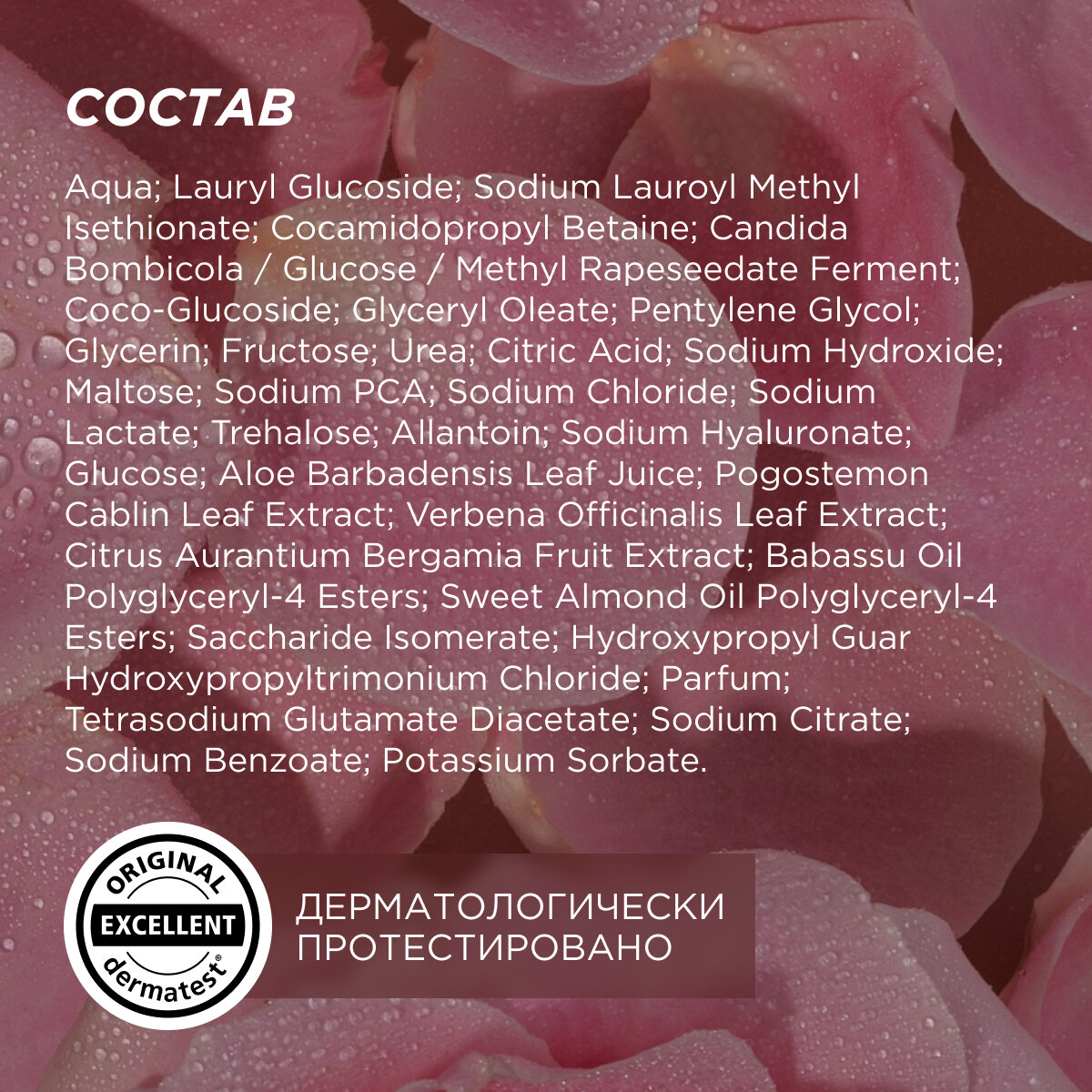 | Состав | aqua; lauryl glucoside; cocamidopropyl betaine; sodium lauroyl methyl isethionate; rapeseed sophorolipids; lauroyl/myristoyl methyl glucamide; coco glucoside; glyceryl oleate; pentylene glycol; glycerin; fructose; urea; citric acid; sodium hydroxide; maltose; sodium pca; sodium chloride; sodium lactate; trehalose; allantoin; sodium hyaluronate; glucose; aloe barbadensis leaf juice; parfum ; babassu oil polyglyceryl-4 esters; sweet almond oil polyglyceryl-4 esters; hydroxypropyl guar hydroxypropyltrimonium chloride; saccharide isomerate; tetrasodium glutamate diacetate; verbena officinalis leaf extract; citrus aurantium bergamia fruit extract; sodium citrate; sodium benzoate |