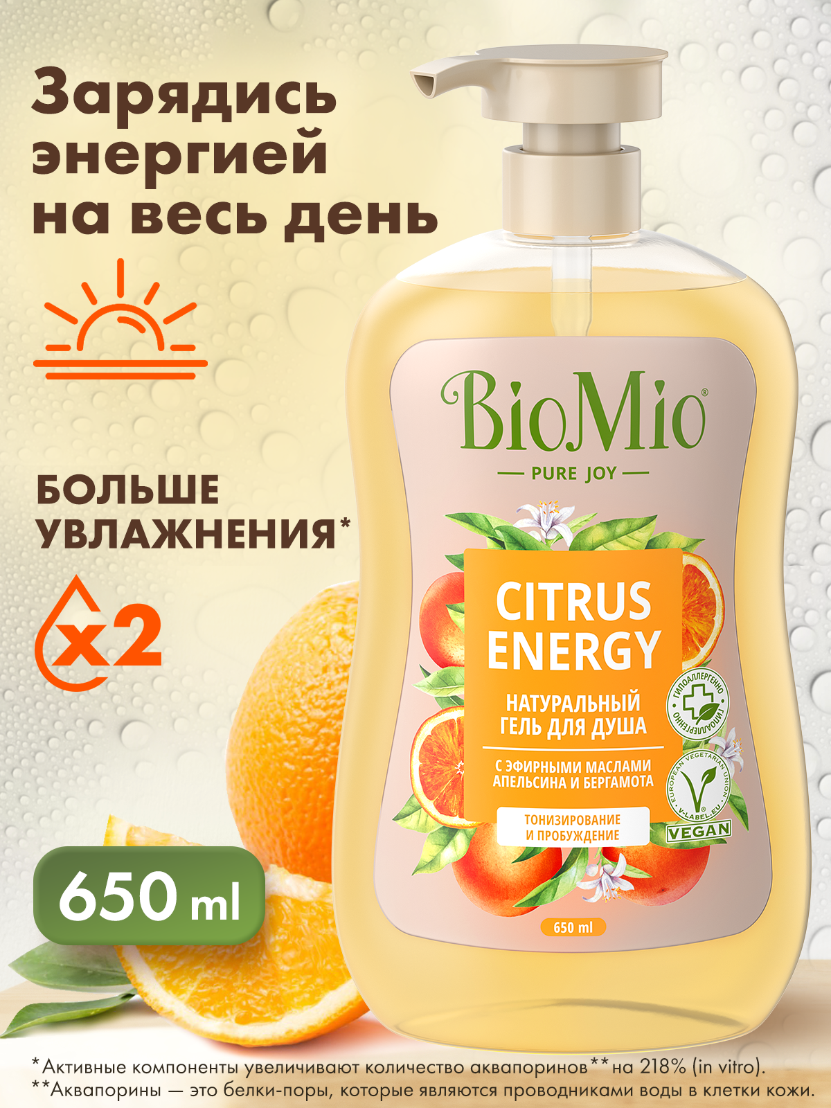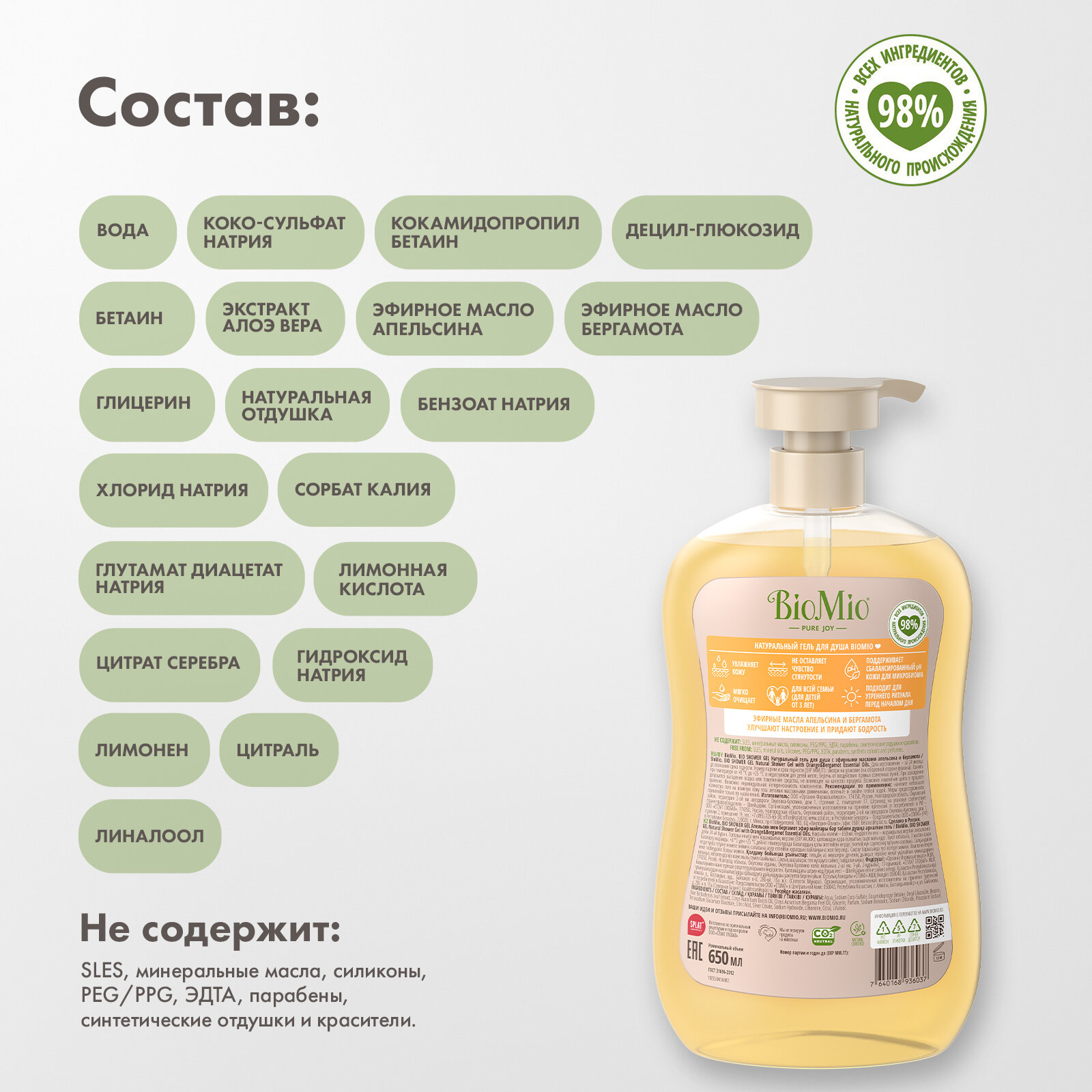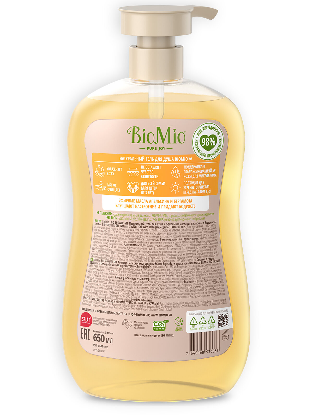 BioMio Гель для душа натуральный, с эфирными маслами апельсина и бергамота, 650 мл