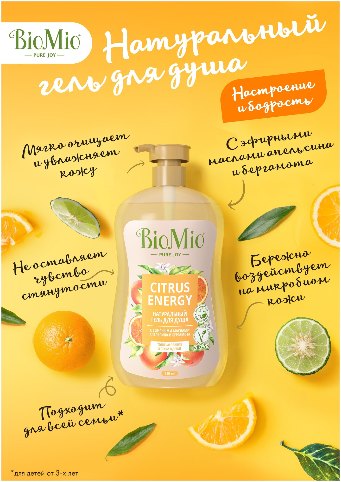 Гель для душа BioMio натуральный, с эфирными маслами апельсина и бергамота, 650 мл, 3 шт