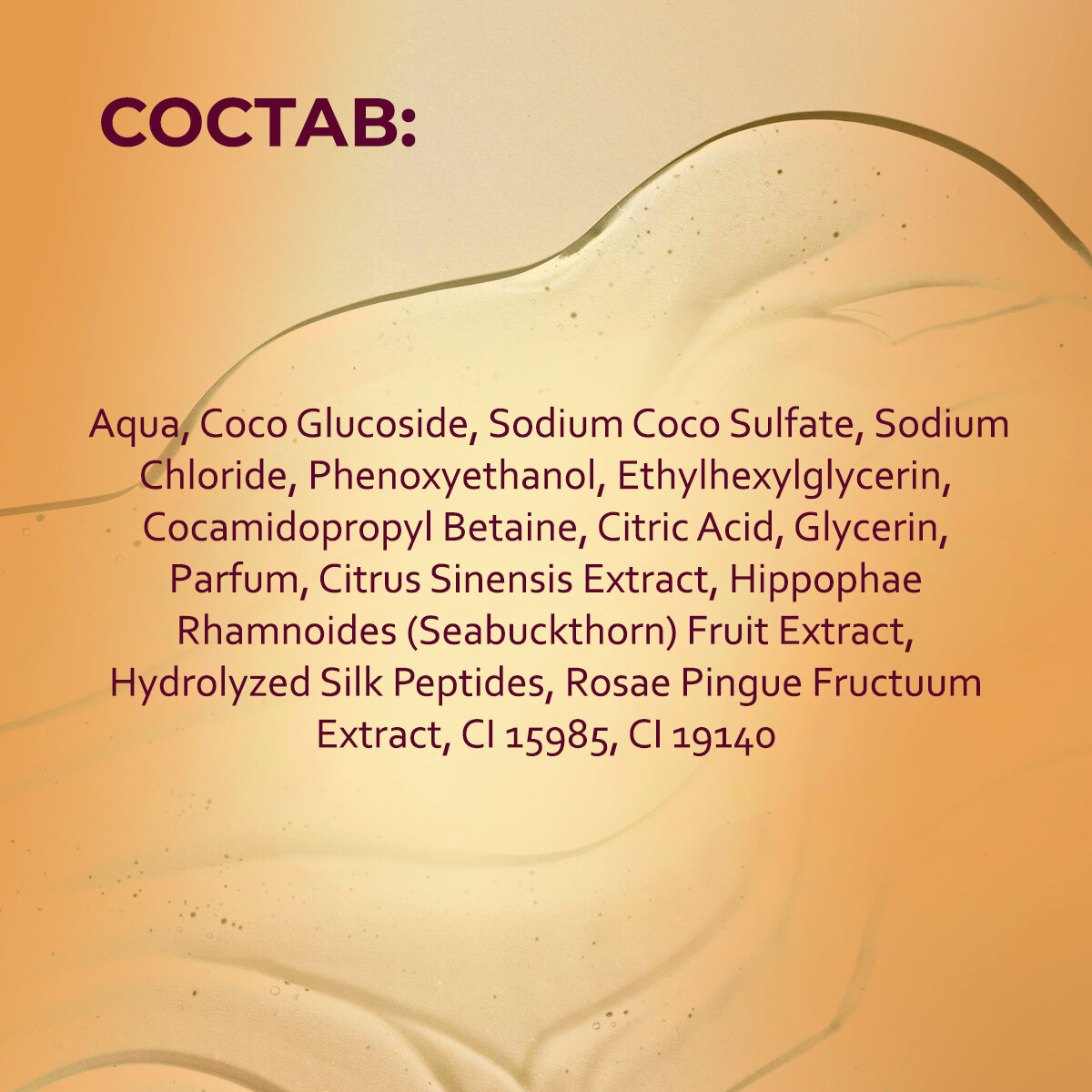 | Состав | Aqua, Sodium Coco Sulfate, Сocamidopropyl Betaine, Sodium Chloride, Decyl Glucoside, Glycerin, Phenoxyethanol, Ethylhexylglycerin, Parfum, Citric Acid, Chamerion Аngustifolium Extract, Hydrolyzed Silk Peptides, Panthenol, Rosae Рingue Fructuum Extract, Thyme Extract, Tilia Сordata Еxtract, CI 19140, CI 15985 |