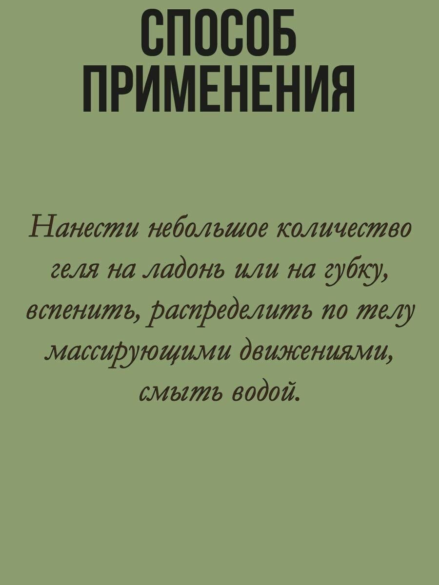 | Способ применения | Нанести небольшое количество геля на ладонь или на губку, вспенить, распределить по телу массирующими движениями, смыть водой. |