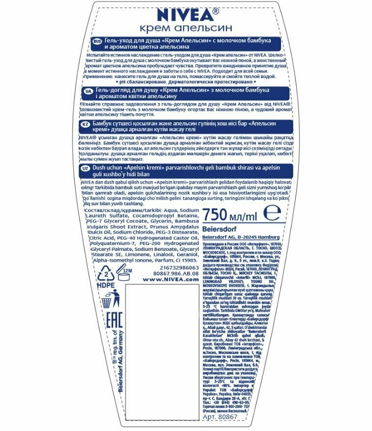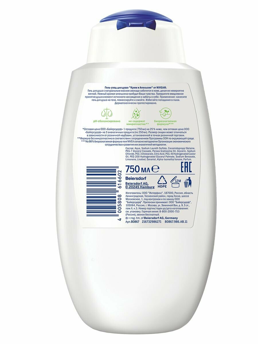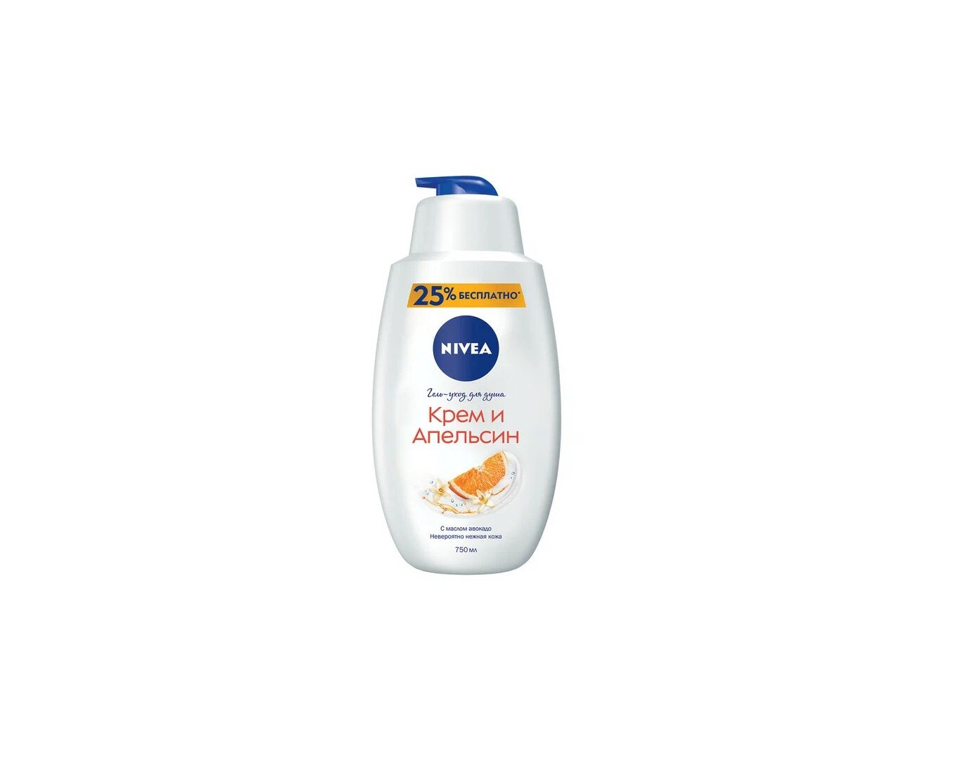 Гель-уход для душа NIVEA "Крем Апельсин" увлажняющий с маслом авокадо, 750 мл.