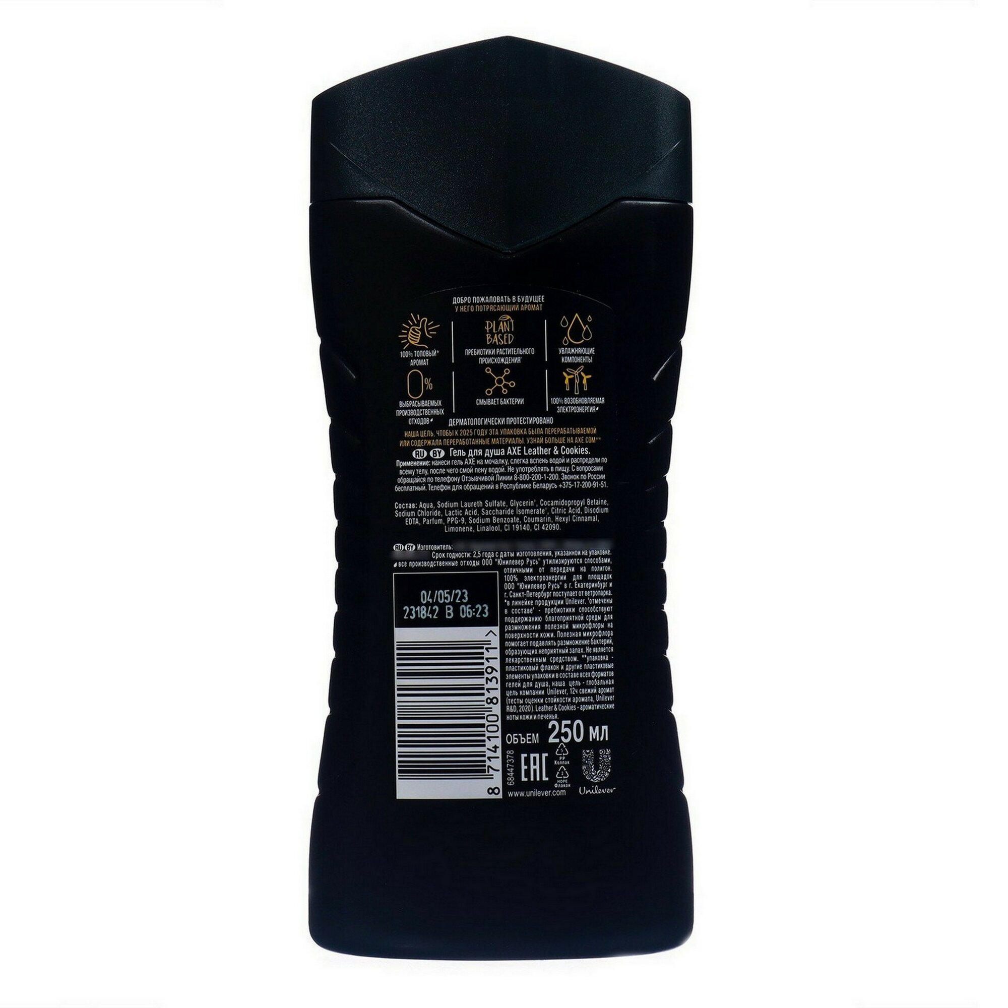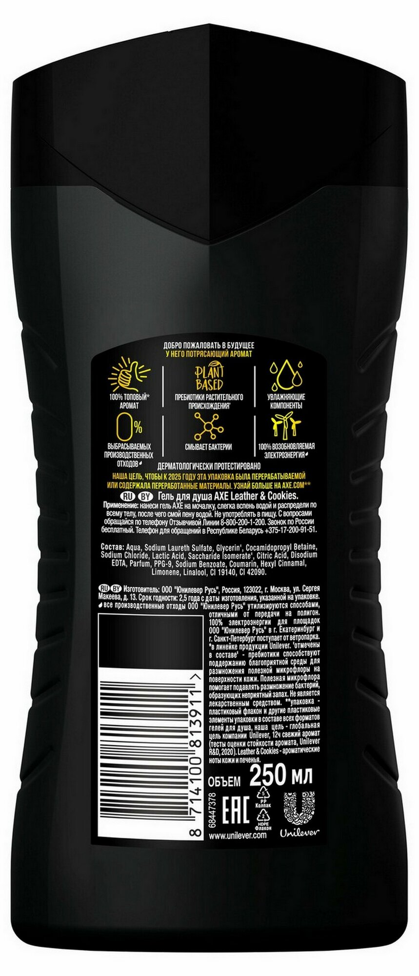 | Способ применения | нанеси гель AXE на мочалку, слегка вспень водой и распредели по всему телу, после чего смой пену водой. Можешь использовать его как шампунь. Избегай попадания в глаза, при попадании тщательно промой их водой |