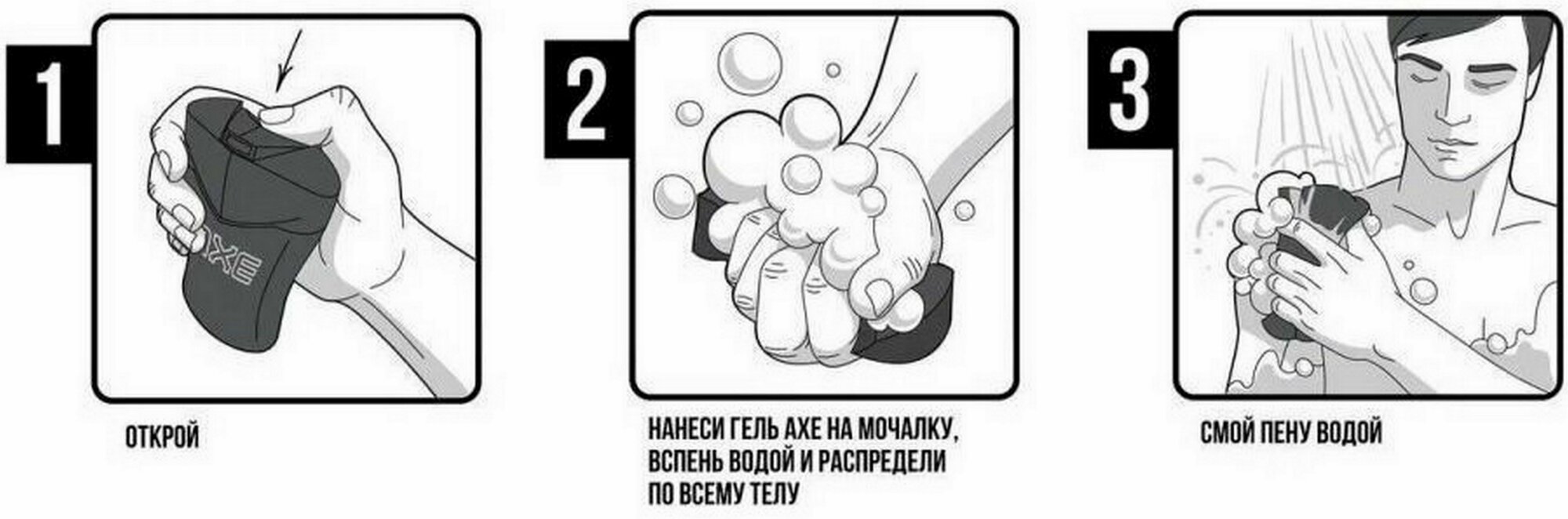 | Способ применения | нанеси гель AXE на мочалку, слегка вспень водой и распредели по всему телу, после чего смой пену водой. Можешь использовать его как шампунь. Избегай попадания в глаза, при попадании тщательно промой их водой |
