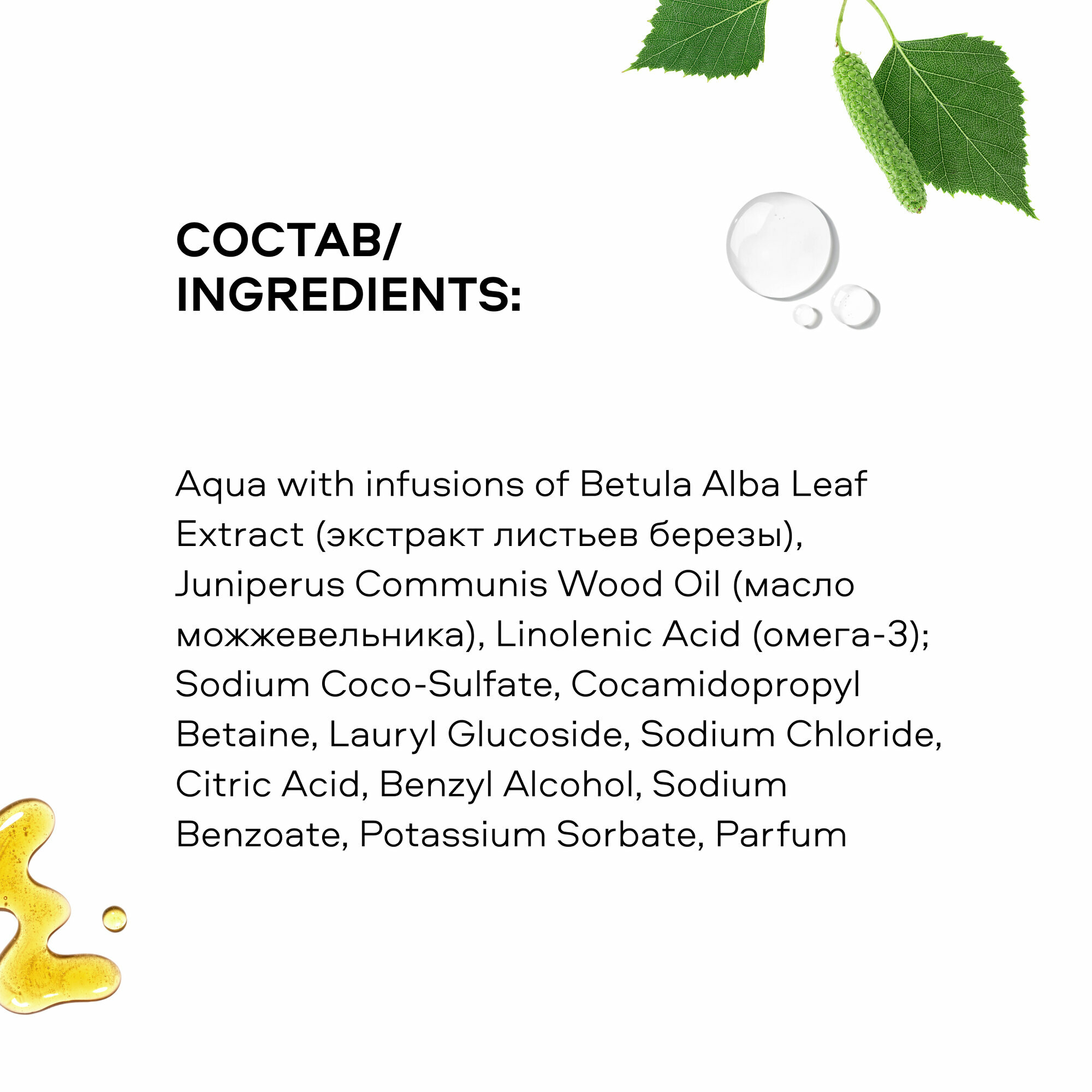| Состав | Aqua with infusions of Betula Alba Leaf Extract (экстракт листьев березы), Juniperus Communis Wood Oil (масло можжевельника), Linolenic Acid (омега-3); Sodium Coco-Sulfate, Cocamidopropyl Betaine, Lauryl Glucoside, Sodium Chloride, Citric Acid, Benzyl Alcohol, Sodium Benzoate, Potassium Sorbate, Parfum |