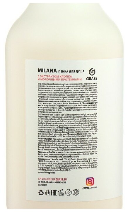 Гель-пенка для душа Grass Milana с экстрактом молочными протеина и хлопком, увлажняющий гель пенка для душка, гипоаллергенный, 750 мл с экстрактом хлопка и молочными протеинами" (флакон 750 мл)