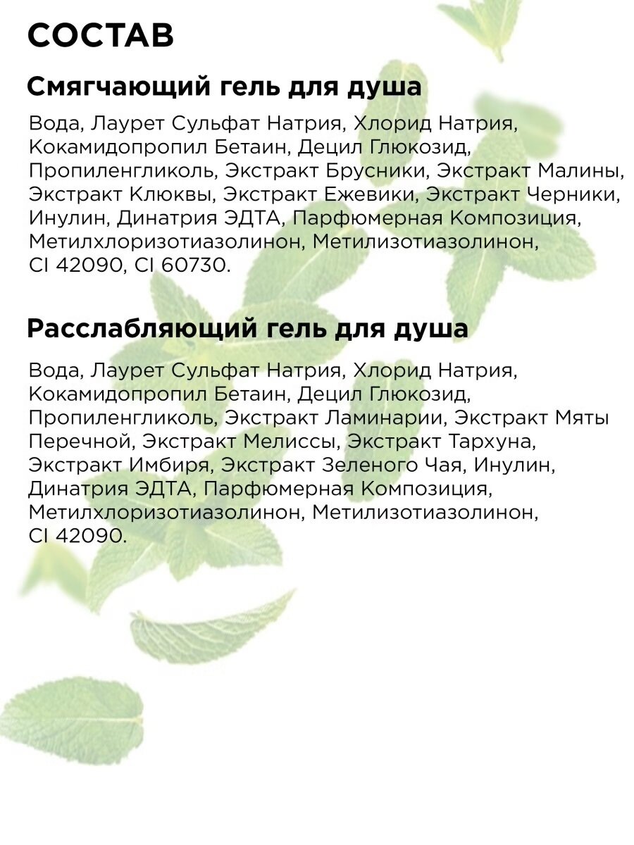 | Состав | 1) Вода, Лаурет Сульфат Натрия, Хлорид Натрия, Кокамидопропил Бетаин, Децил Глюкозид,Пропиленгликоль, Экстракт Брусники, Экстракт Малины, Экстракт Клюквы, Экстракт Ежевики, Экстракт Черники, Инулин, Динатрия ЭДТА, Парфюмерная Композиция, Метилхлоризотиазолинон, Метилизотиазолинон, CI 42090, CI 60730. 2) Вода, Лаурет Сульфат Натрия, Хлорид Натрия, Кокамидопропил Бетаин, Децил Глюкозид,Пропиленгликоль, Экстракт Меда, Экстракт Арники, Экстракт Клубники, Экстракт Манго, Экстракт Имбиря, Экстракт Зеленого Чая, Инулин, Динатрия ЭДТА, Парфюмерная Композиция, Метилхлоризотиазолинон, Метилизотиазолинон, CI 14720. 3) Вода, Лаурет Сульфат Натрия, Хлорид Натрия, Кокамидопропил Бетаин, Децил Глюкозид,Пропиленгликоль, Экстракт Ламинарии, Экстракт Мяты Перечной, Экстракт Мелиссы, Экстракт Тархуна, Экстракт Имбиря, Экстракт Зеленого Чая, Инулин, Динатрия ЭДТА, Парфюмерная Композиция, Метилхлоризотиазолинон, Метилизотиазолинон, CI 42090. |