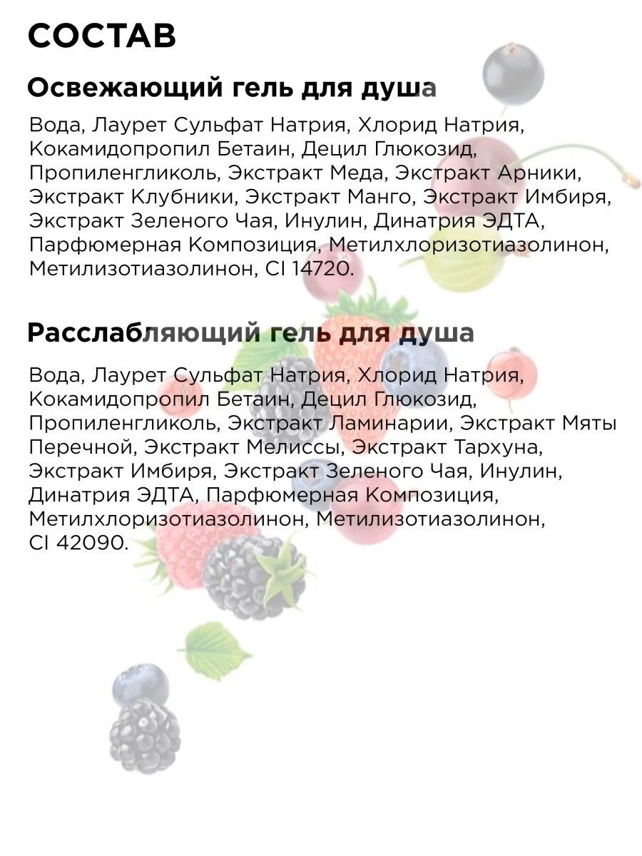 | Состав | 1) Вода, Лаурет Сульфат Натрия, Хлорид Натрия, Кокамидопропил Бетаин, Децил Глюкозид,Пропиленгликоль, Экстракт Брусники, Экстракт Малины, Экстракт Клюквы, Экстракт Ежевики, Экстракт Черники, Инулин, Динатрия ЭДТА, Парфюмерная Композиция, Метилхлоризотиазолинон, Метилизотиазолинон, CI 42090, CI 60730. 2) Вода, Лаурет Сульфат Натрия, Хлорид Натрия, Кокамидопропил Бетаин, Децил Глюкозид,Пропиленгликоль, Экстракт Меда, Экстракт Арники, Экстракт Клубники, Экстракт Манго, Экстракт Имбиря, Экстракт Зеленого Чая, Инулин, Динатрия ЭДТА, Парфюмерная Композиция, Метилхлоризотиазолинон, Метилизотиазолинон, CI 14720. 3) Вода, Лаурет Сульфат Натрия, Хлорид Натрия, Кокамидопропил Бетаин, Децил Глюкозид,Пропиленгликоль, Экстракт Ламинарии, Экстракт Мяты Перечной, Экстракт Мелиссы, Экстракт Тархуна, Экстракт Имбиря, Экстракт Зеленого Чая, Инулин, Динатрия ЭДТА, Парфюмерная Композиция, Метилхлоризотиазолинон, Метилизотиазолинон, CI 42090. |