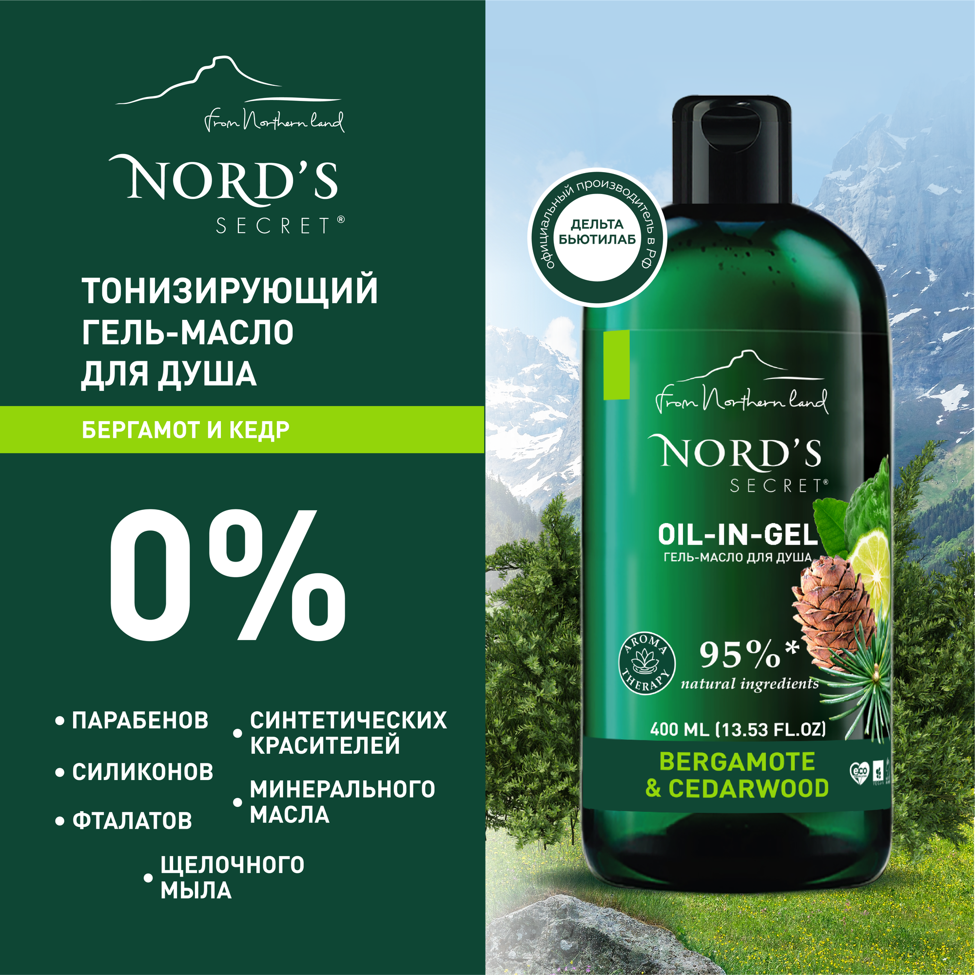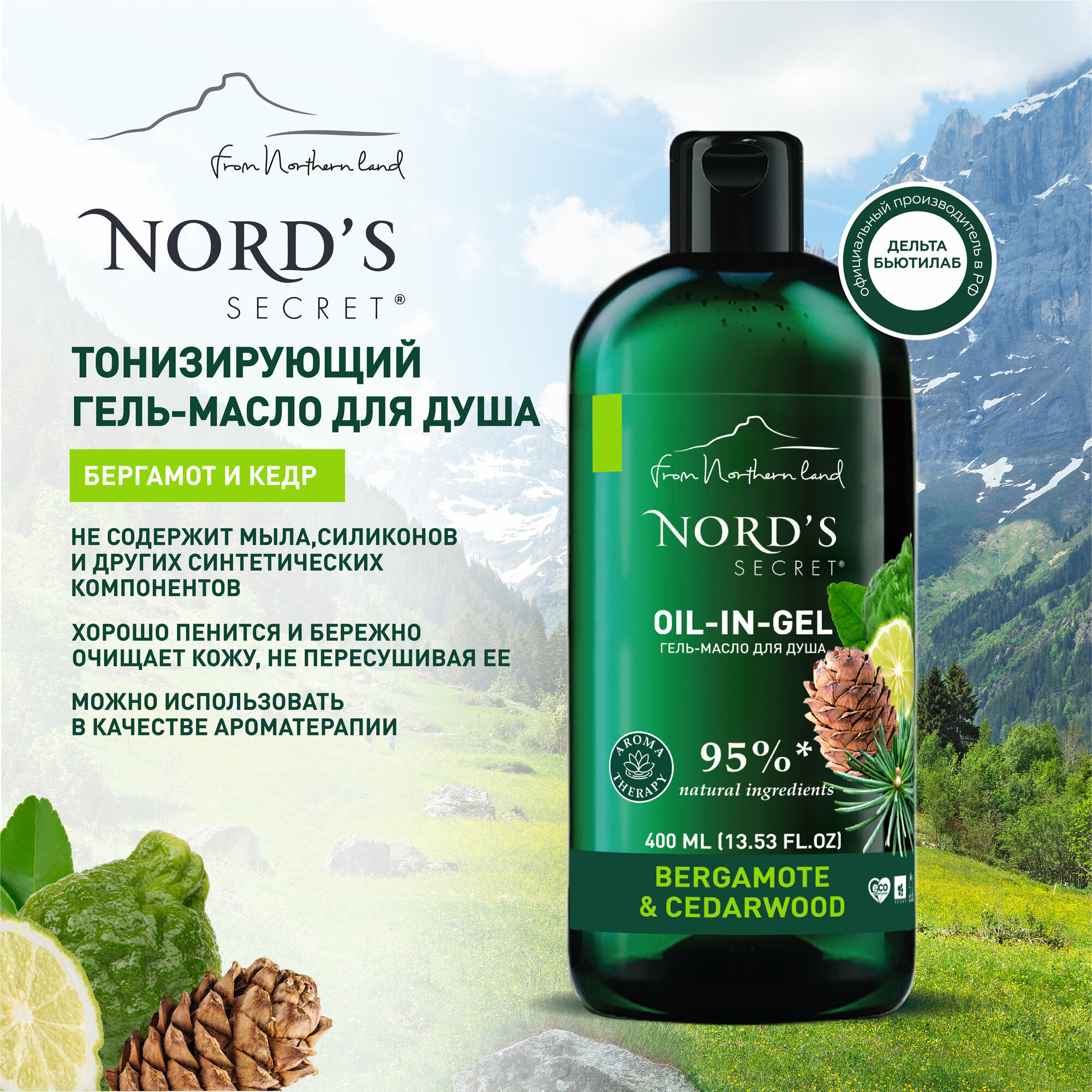 Купить NORDS SECRET Тонизирующий гель масло для душа "Бергамот и кедр", 400 мл