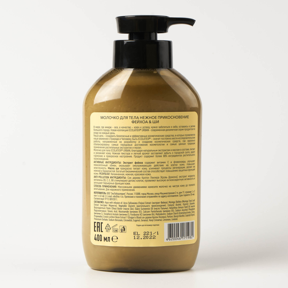 | Дополнительная информация | Молочко для тела ECOLATIER URBAN, благодаря натуральным экстрактам и маслам в составе, питает и увлажняет кожу. Нежная текстура и легкий аромат заставляют забыть о городской суете, дарят гармонию и прекрасное настроение. Продукт содержит более 98% ингредиентов растительного происхождения. АКТИВНЫЕ ИНГРЕДИЕНТЫ: Экстракт фейхоа содержит витамин С и флавоноиды, улучшает межклеточный обмен, оказывает омолаживающее действие на клетки кожи, повышает эластичность. Масло ши прекрасно питает кожу, усиливает процессы регенерации, делает ее нежной и бархатистой. Богатый биохимический состав способствует повышению защитных функций кожи. Эффект: увлажненная, нежная, красивая кожа. Сок дерева Кротон Лехлера (Кровь Дракона), экстракт моринги, витамины В5, В6, С, Е стимулируют детокс клеток, регенерируют кожу, проявляют высокую антиоксидантную активность и улучшают барьерные функции кожи. |