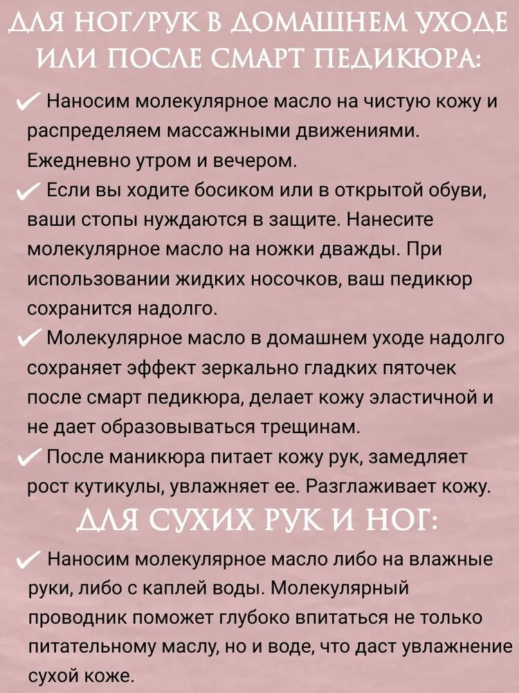 | Способ применения | Нанесите на не влажную, чистую кожу легкими, массирующими движениями. В случае сухости кожи - добавить каплю воды в каплю молекулярного смарт масла. |